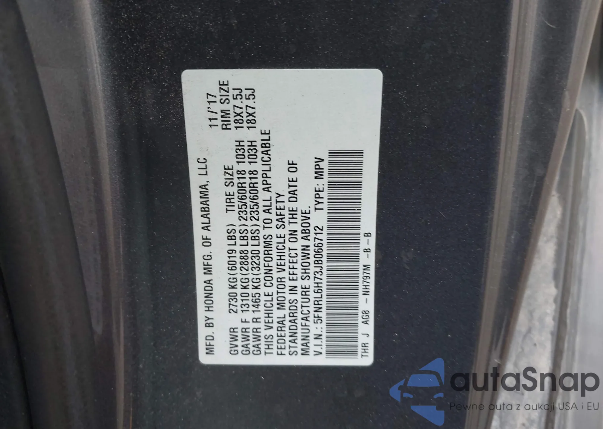 VIN: 5FNRL6H73JB066712