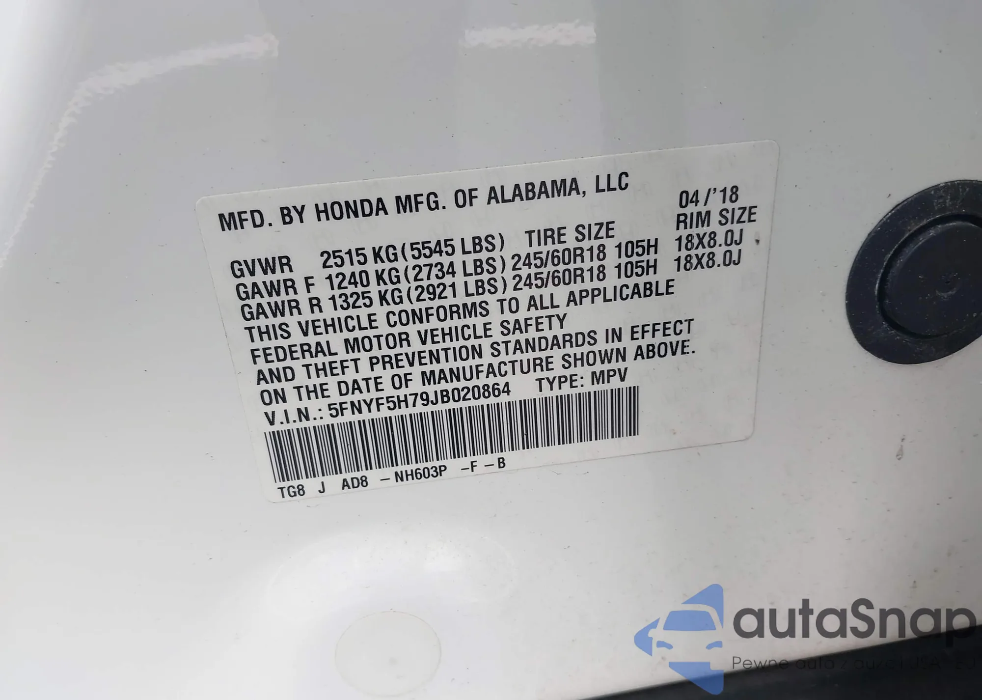 Автомобиль Honda Pilot 2018 (VIN 5FNYF5H79JB020864) ранее не участвовал в торгах. Документы чистые, пробег соответствует или ниже среднего по рынку. Продаётся страховой компанией — рекомендуем покупку. Доставка в порт займет около 6–8 недель.