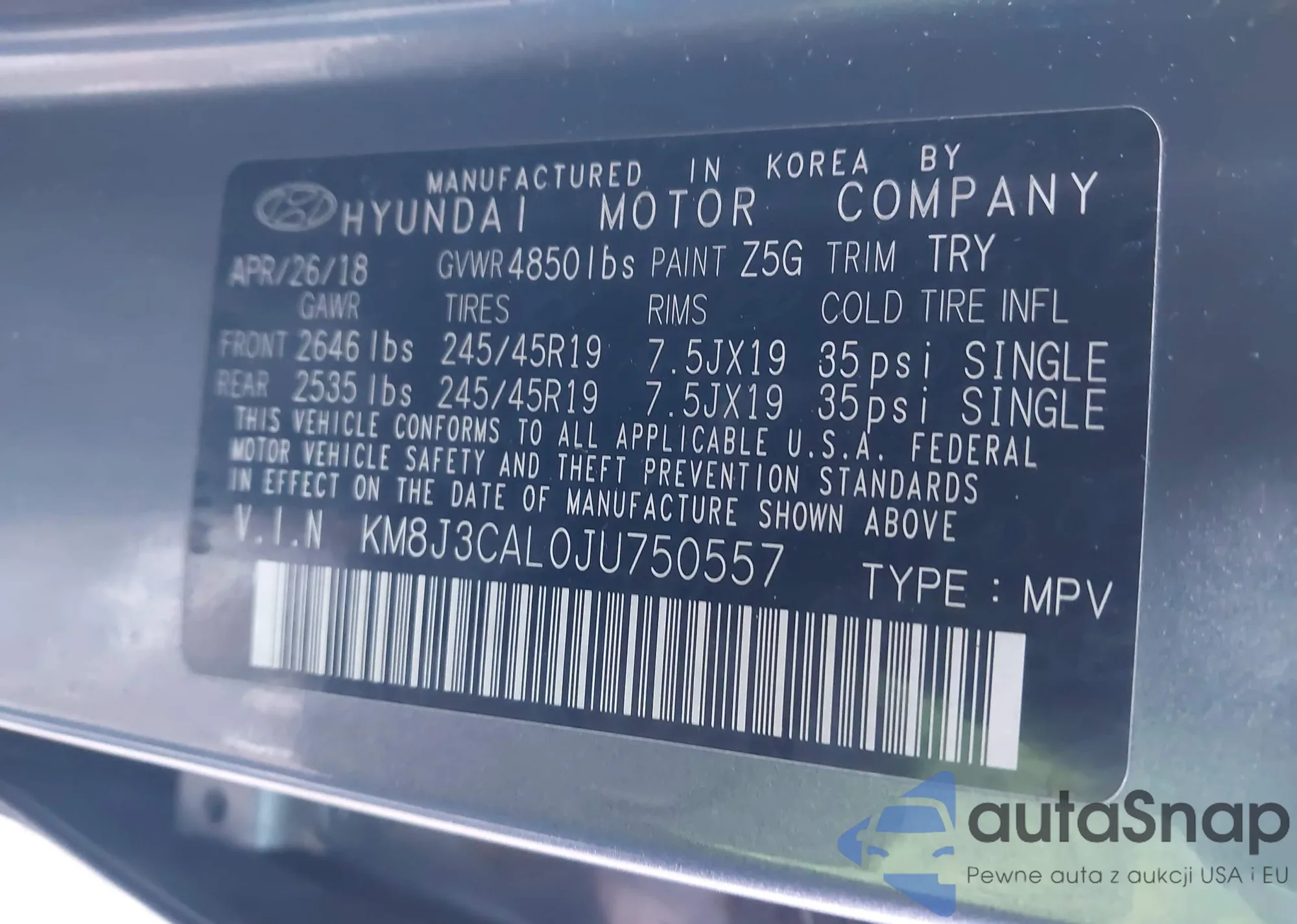 Автомобиль Hyundai Tucson 2018 (VIN KM8J3CAL0JU750557) ранее не участвовал в торгах. Документы чистые, пробег соответствует или ниже среднего по рынку. Продаётся страховой компанией — рекомендуем покупку. Доставка в порт займет около 6–8 недель.