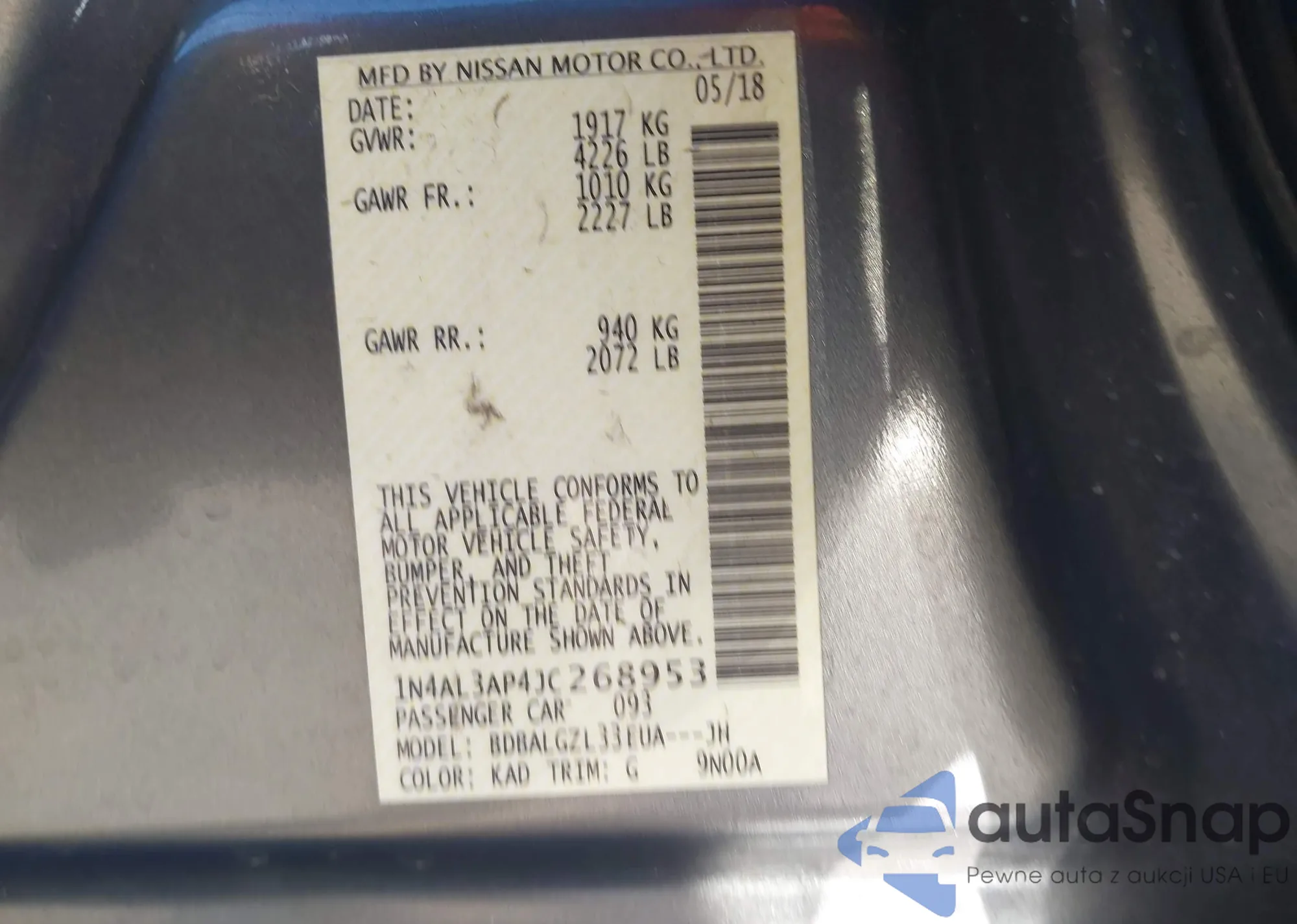 Автомобиль Nissan Altima 2018 (VIN 1N4AL3AP4JC268953) ранее не участвовал в торгах. Документы чистые, пробег соответствует или ниже среднего по рынку. Продаётся страховой компанией — рекомендуем покупку. Доставка в порт займет около 6–8 недель.