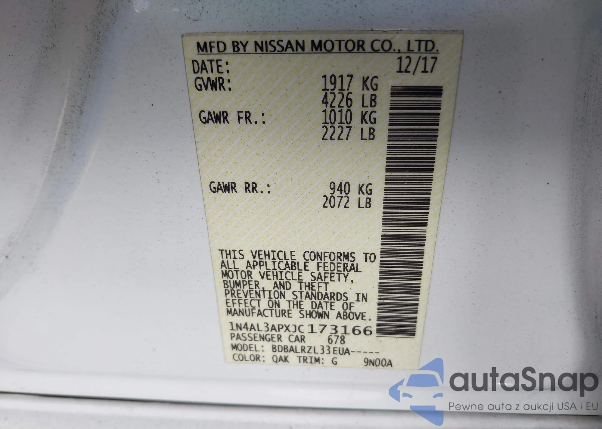 • VIN: 1N4AL3APXJC173166