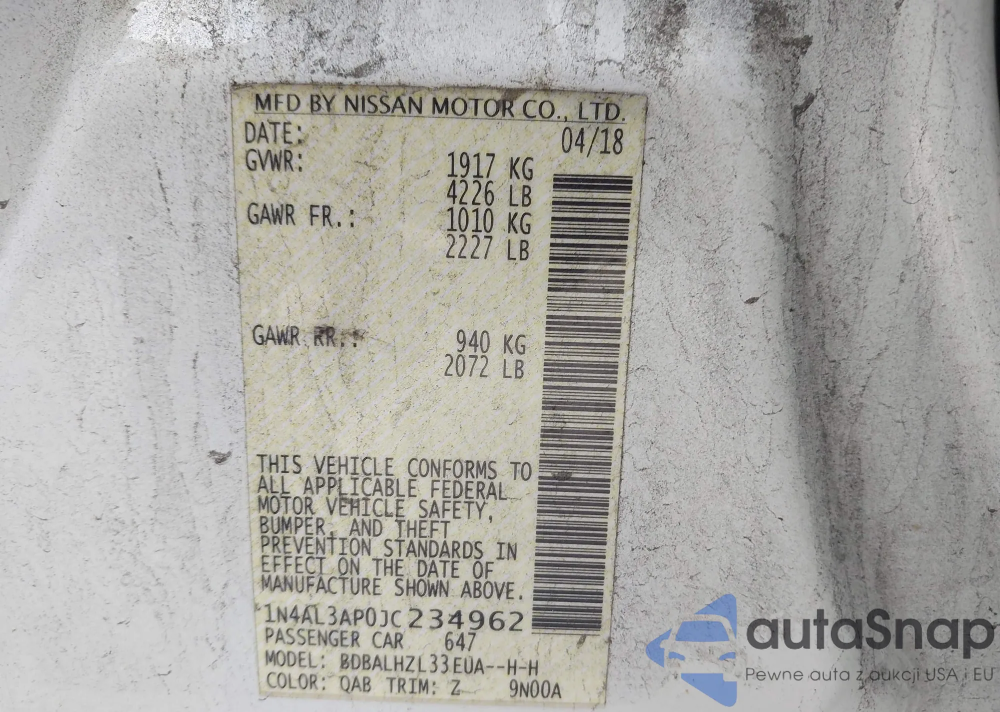 • VIN: 1N4AL3AP0JC234962