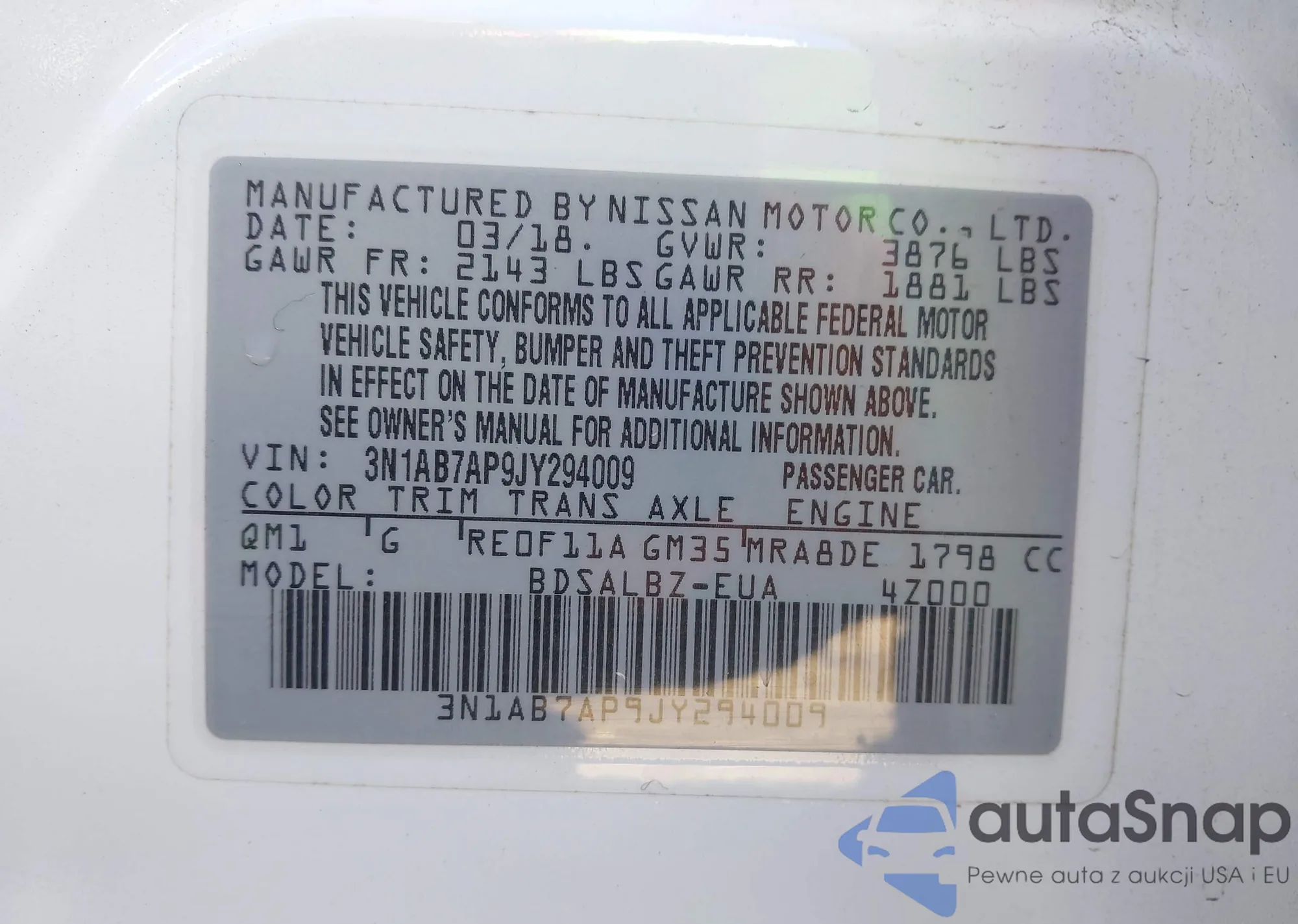 Автомобиль Nissan Sentra 2018 (VIN 3N1AB7AP9JY294009) ранее не участвовал в торгах. Документы чистые, пробег соответствует или ниже среднего по рынку. Продаётся страховой компанией — рекомендуем покупку. Доставка в порт займет около 6–8 недель.