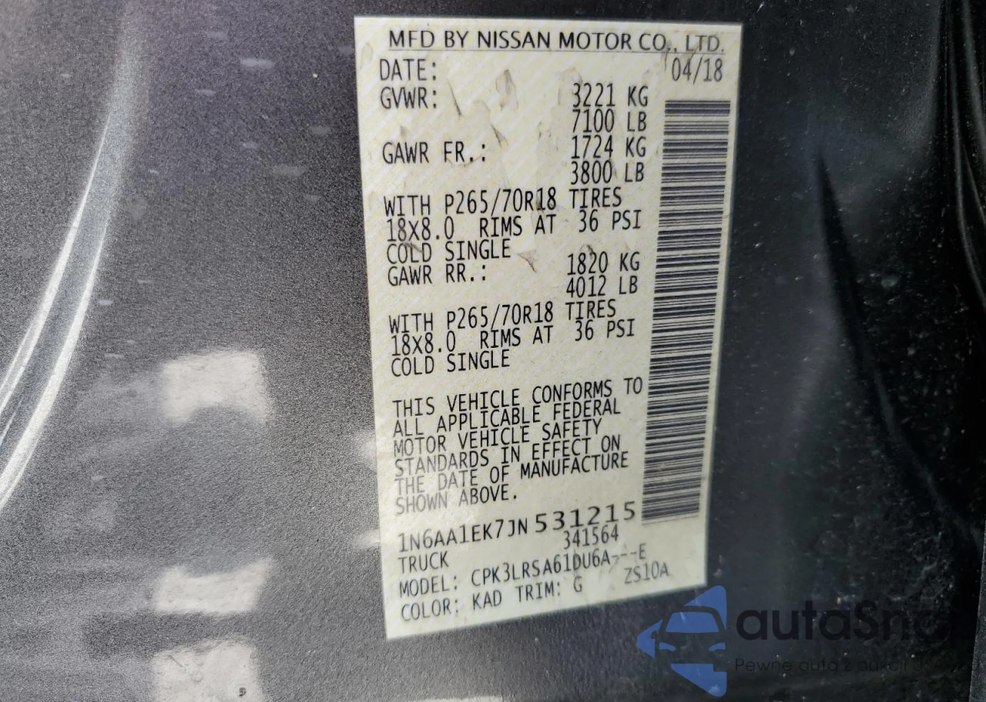 • VIN: 1N6AA1EK7JN531215