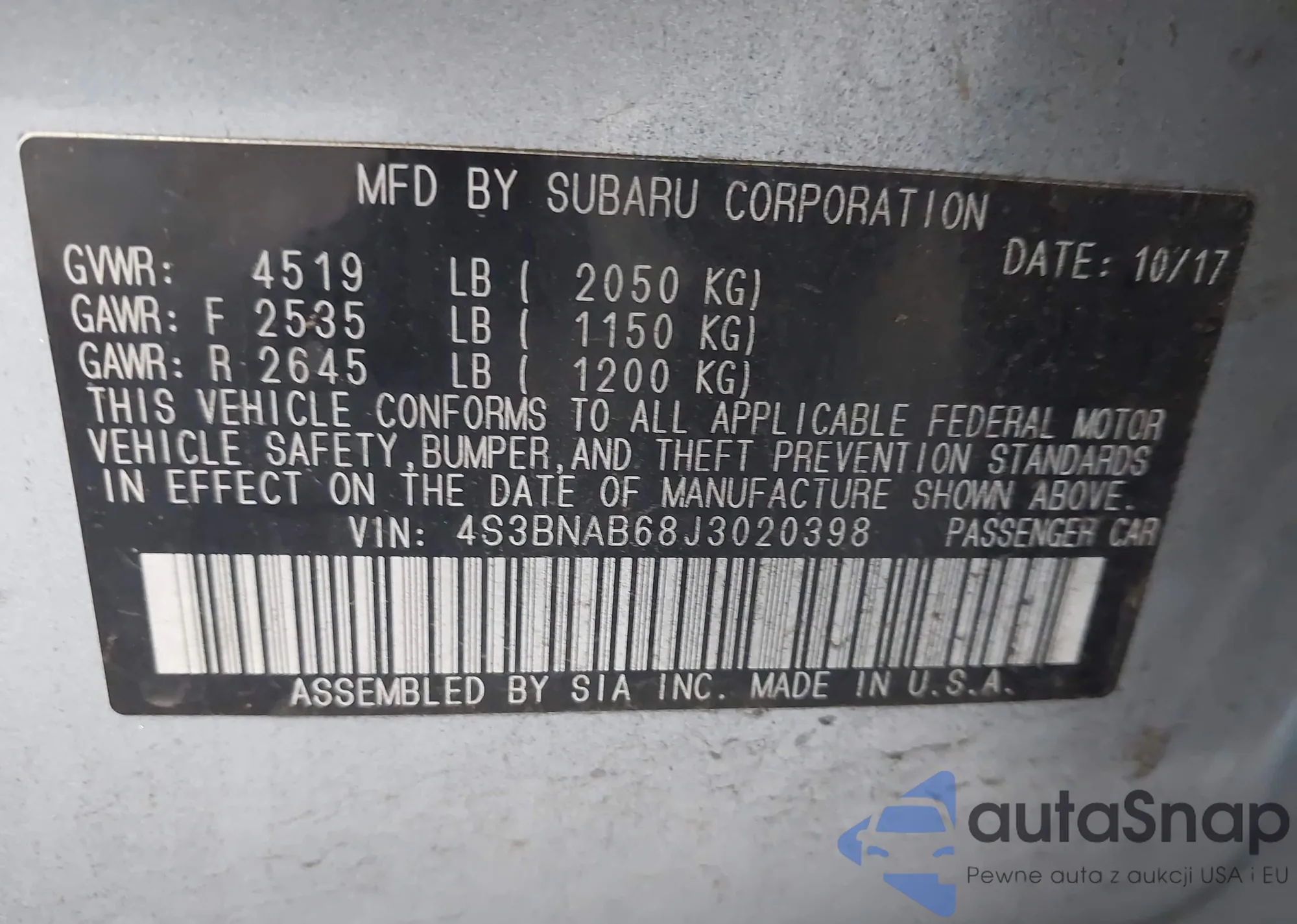VIN: 4S3BNAB68J3020398