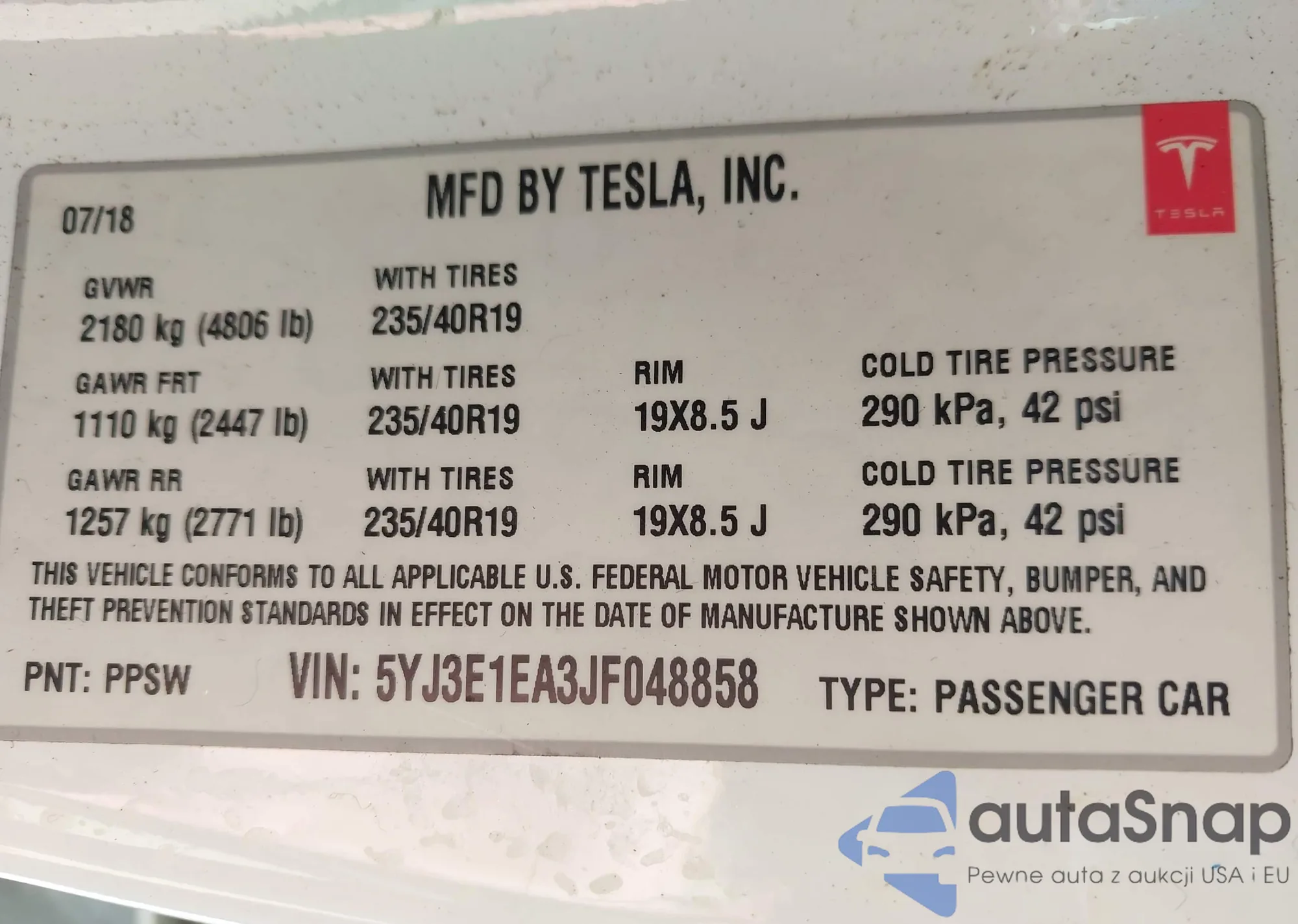 VIN: 5YJ3E1EA3JF048858