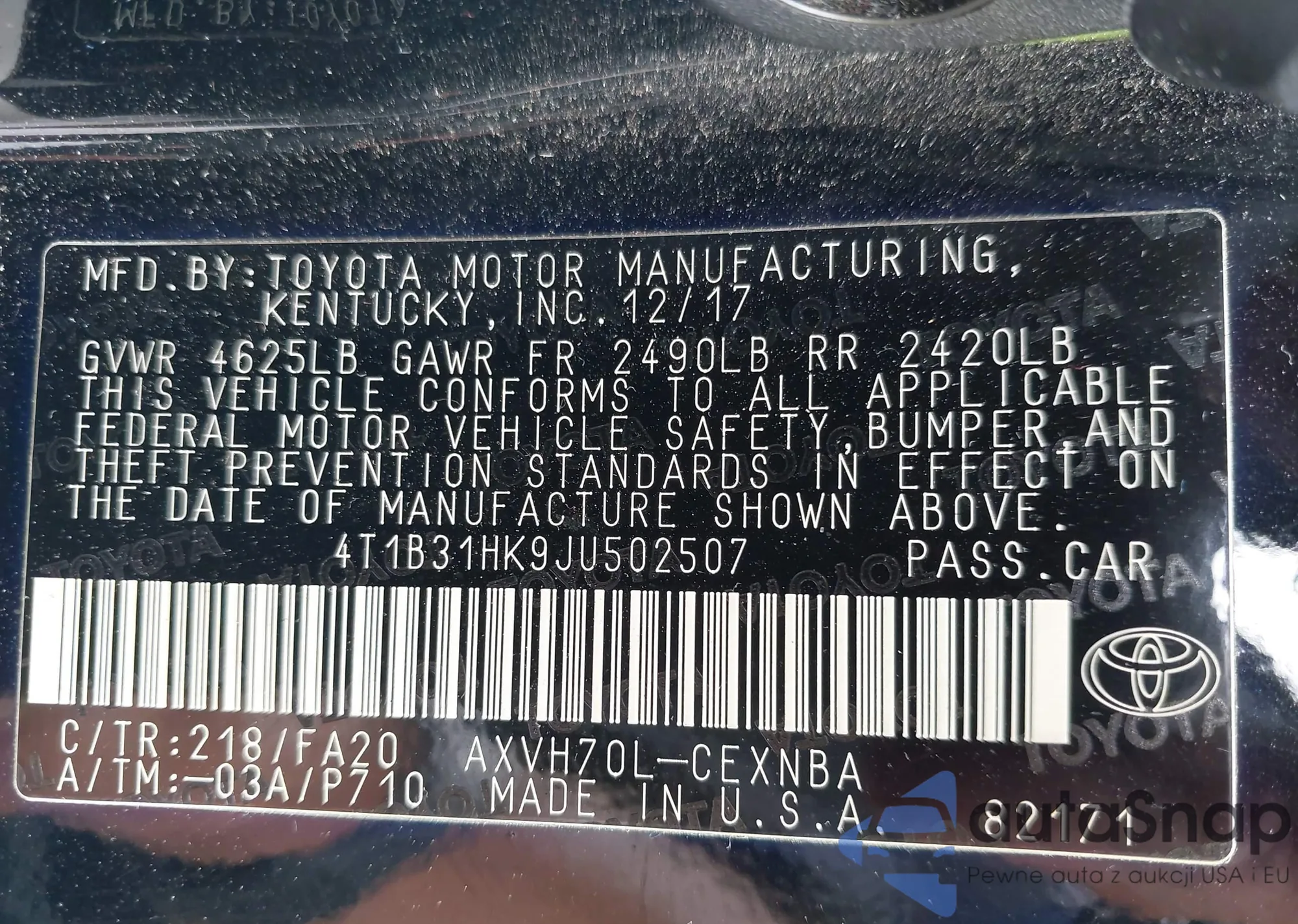 VIN: 4T1B31HK9JU502507