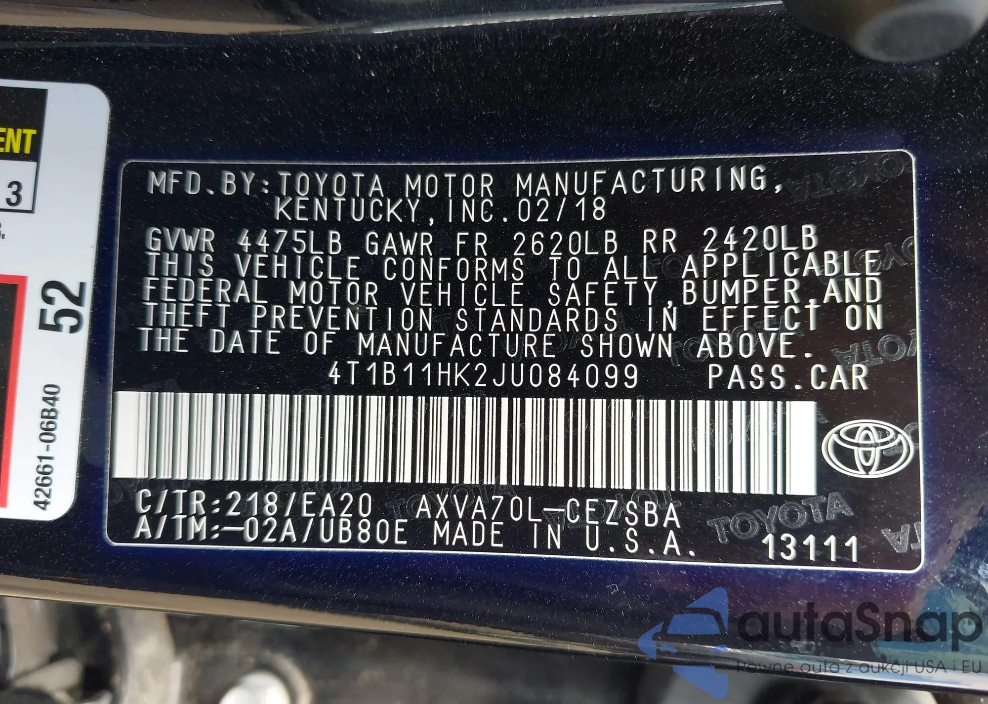 VIN: 4T1B11HK2JU084099