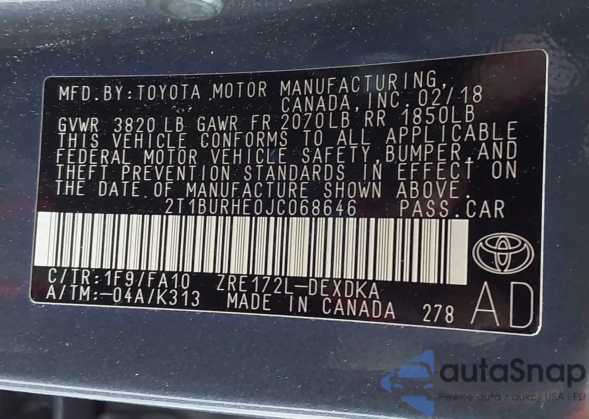 VIN: 2T1BURHE0JC068646