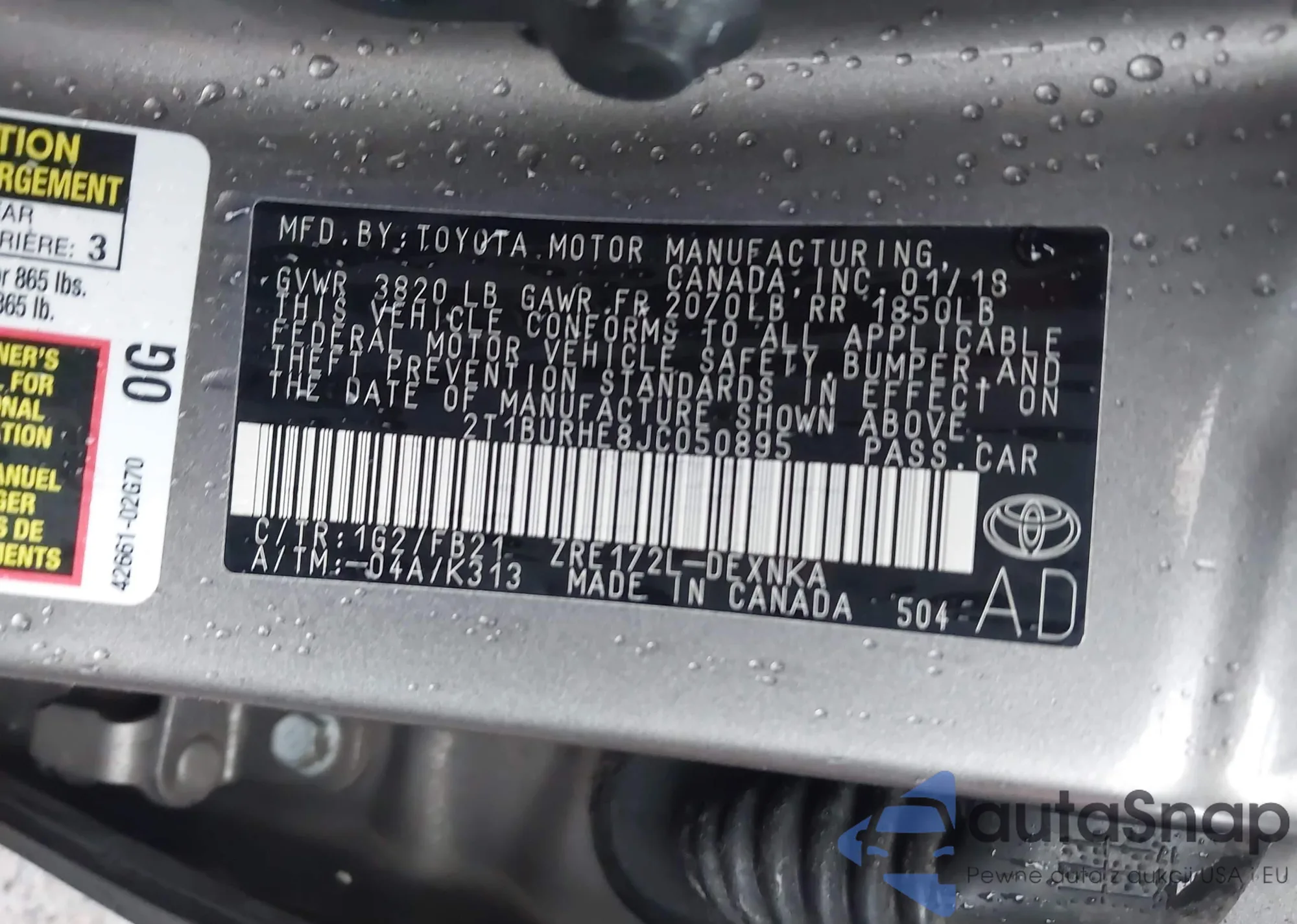 Автомобиль Toyota Corolla 2018 (VIN 2T1BURHE8JC050895) имеет документы, препятствующие регистрации. Могут возникнуть сложности при экспорте и регистрации. Обратитесь к экспертам AutaSnap для поиска альтернатив.
