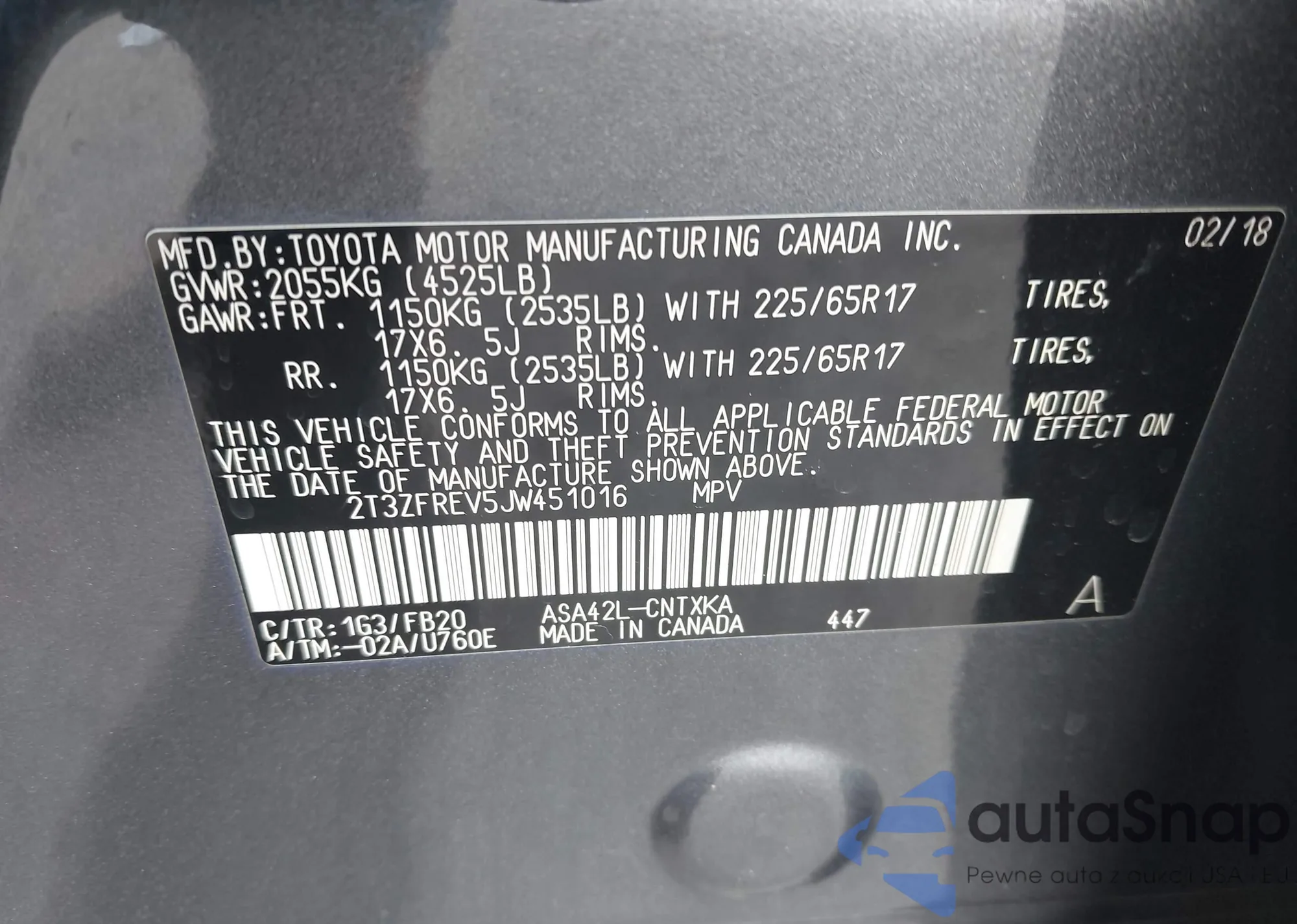 VIN: 2T3ZFREV5JW451016