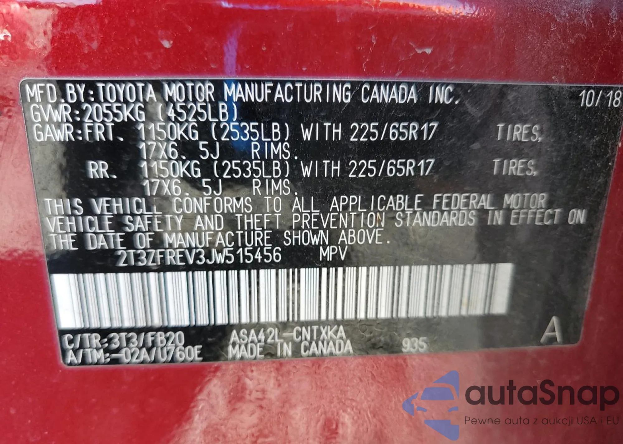 VIN: 2T3ZFREV3JW515456