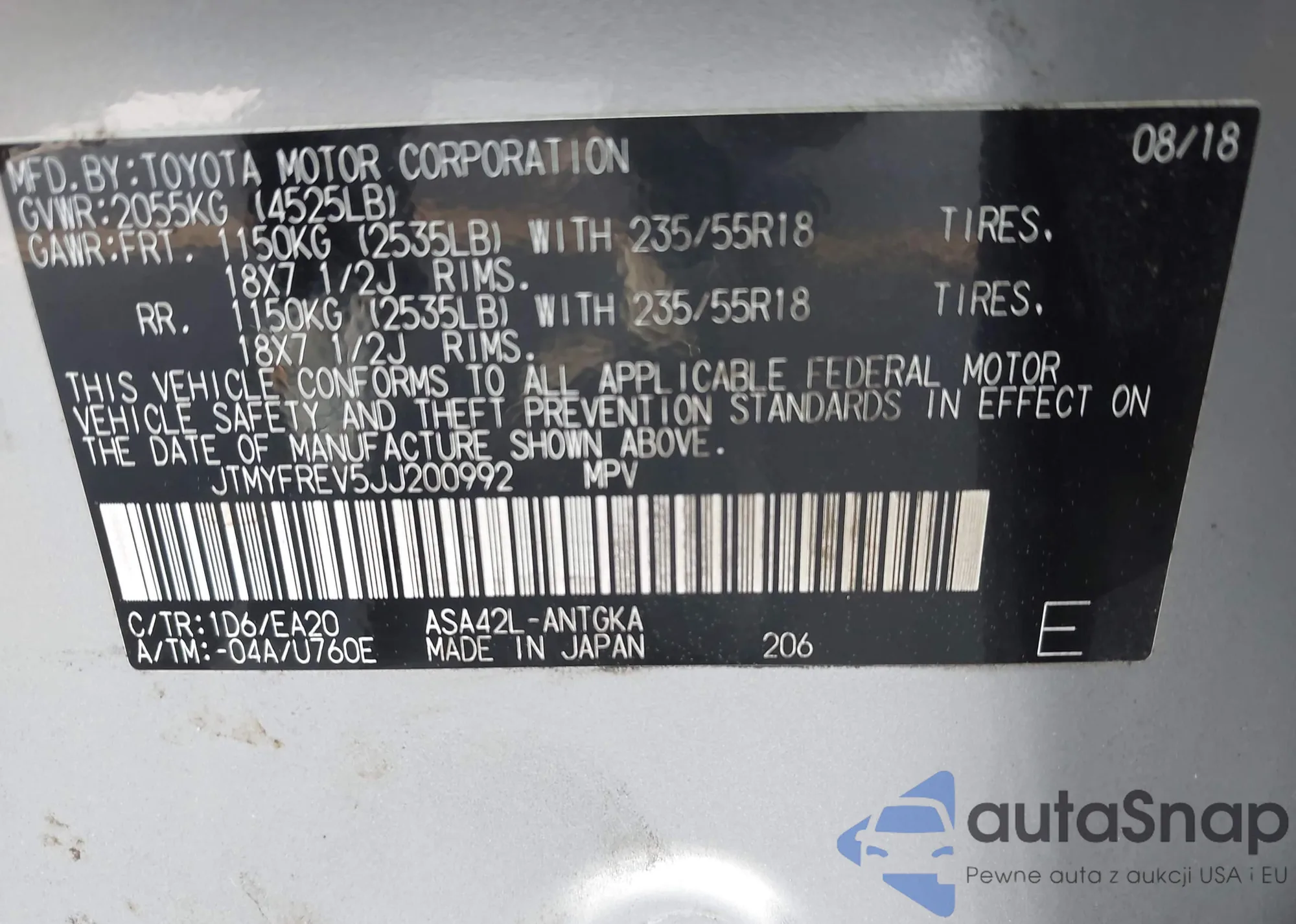 Автомобиль Toyota RAV 4 2018 (VIN JTMYFREV5JJ200992) ранее не участвовал в торгах. Документы чистые, пробег соответствует или ниже среднего по рынку. Продаётся страховой компанией — рекомендуем покупку. Доставка в порт займет около 6–8 недель.