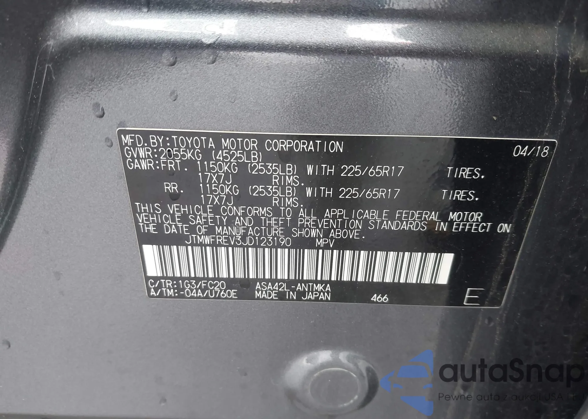 • VIN: JTMWFREV3JD123190