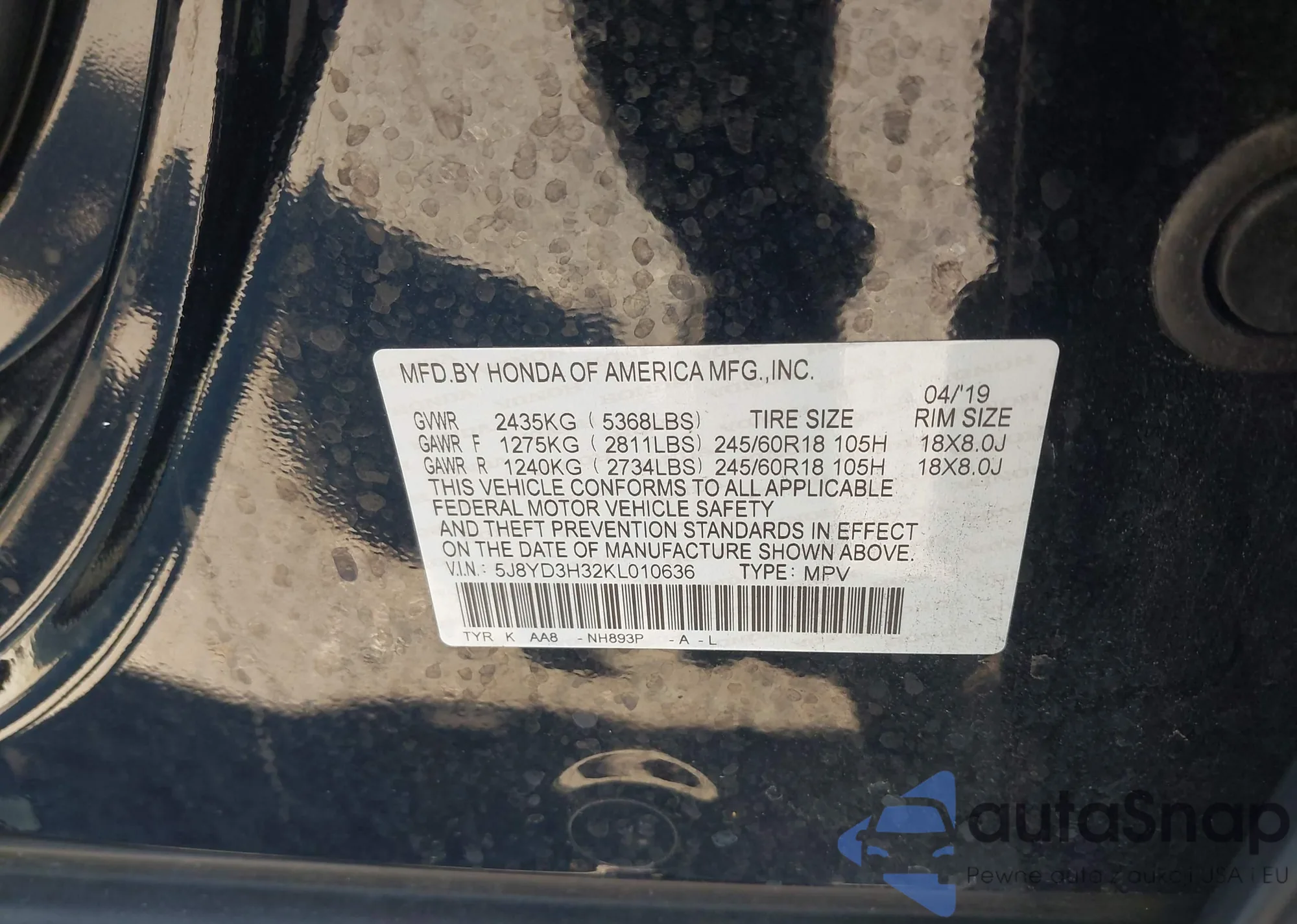 • VIN: 5J8YD3H32KL010636