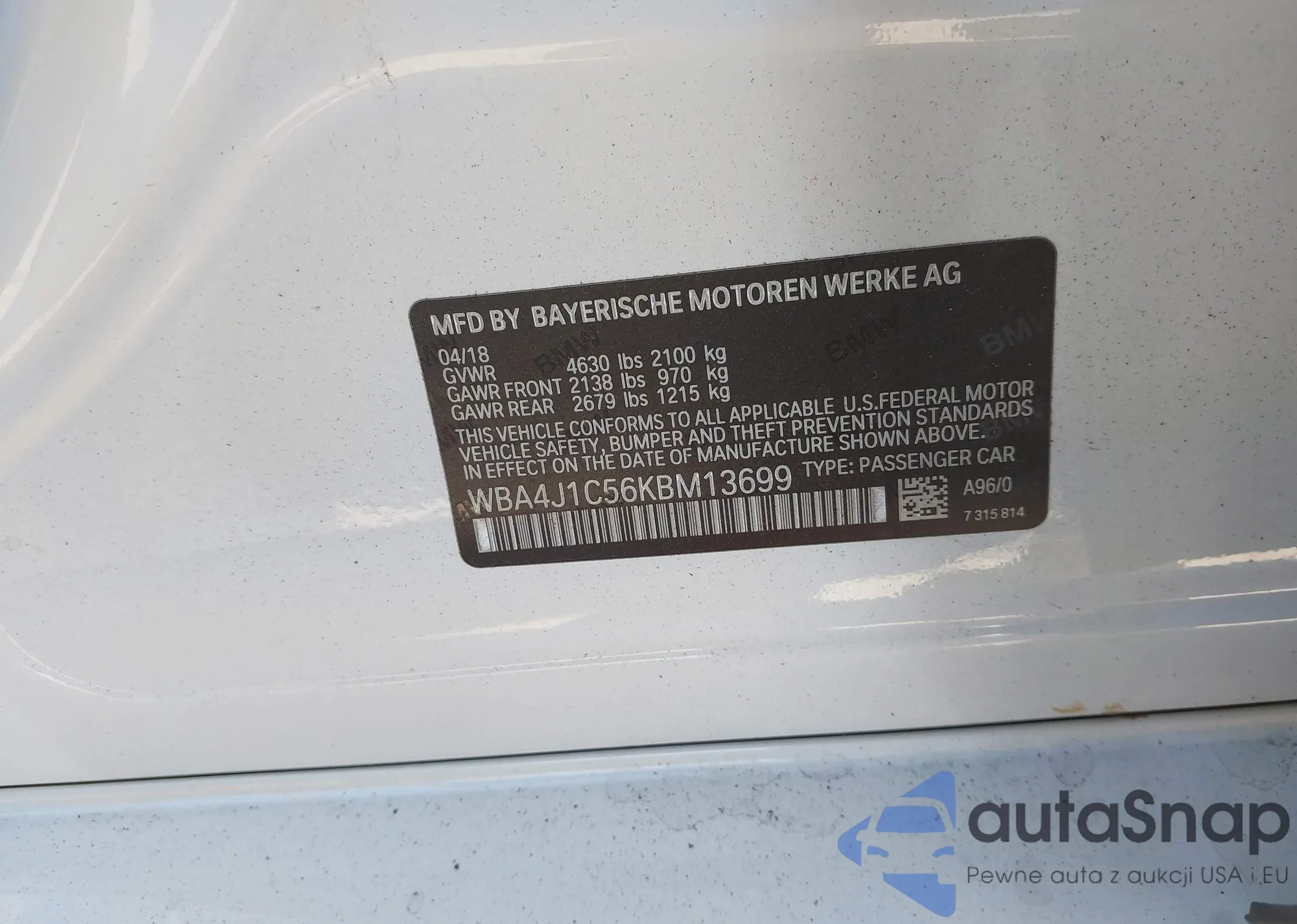 VIN: WBA4J1C56KBM13699