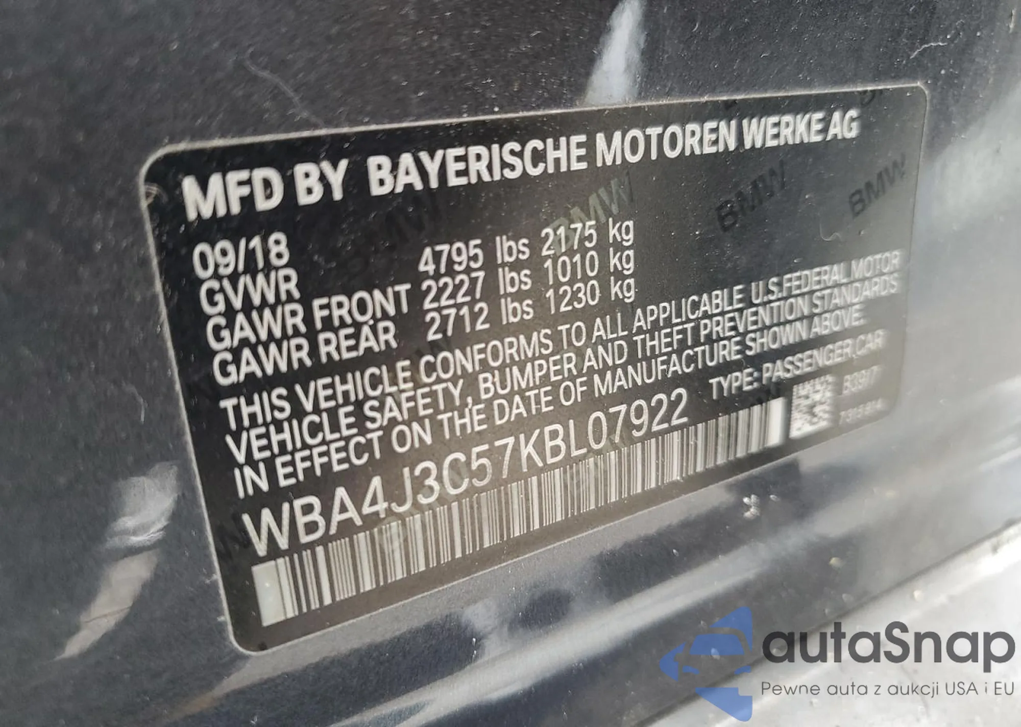 VIN: WBA4J3C57KBL07922