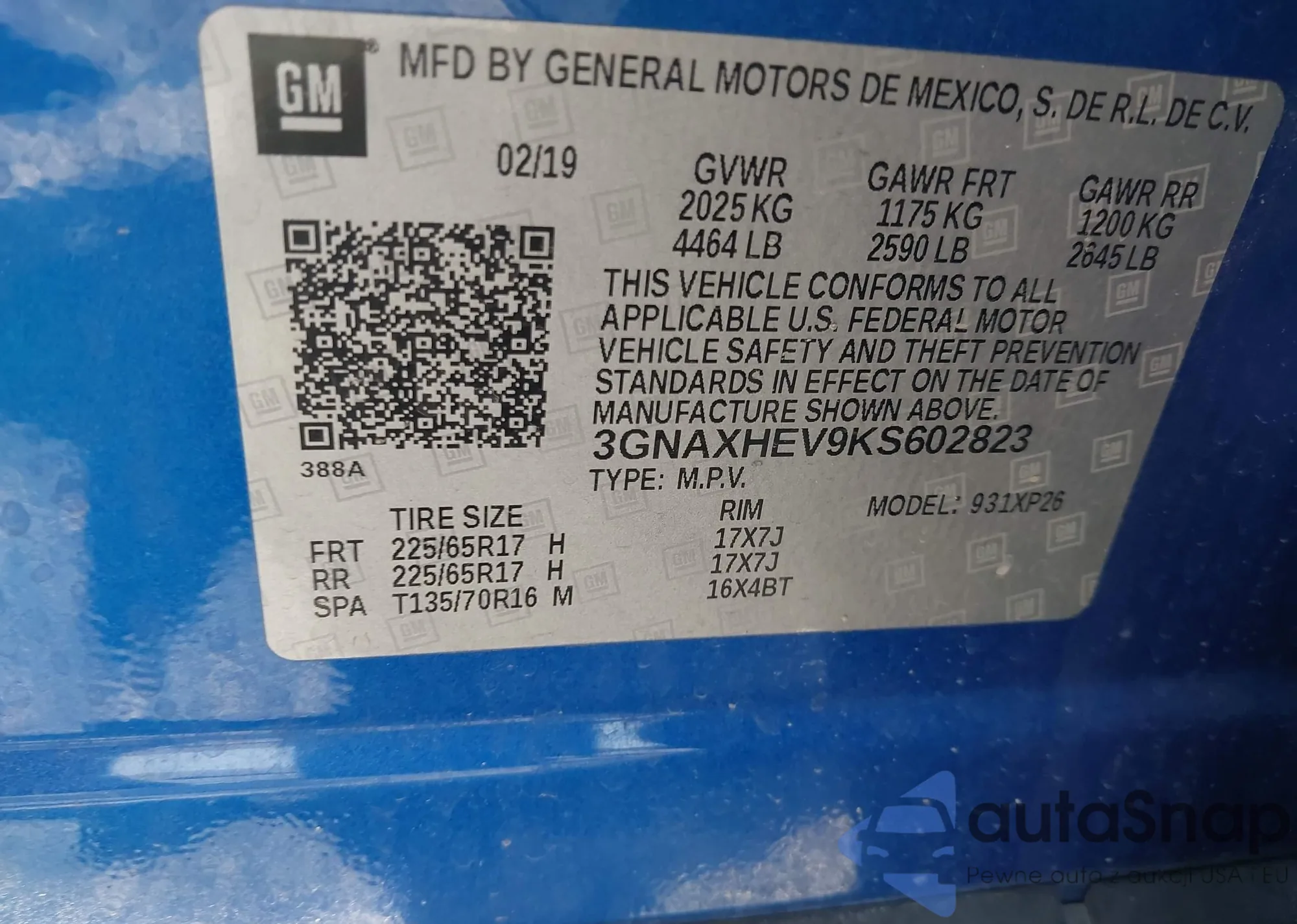 VIN: 3GNAXHEV9KS602823