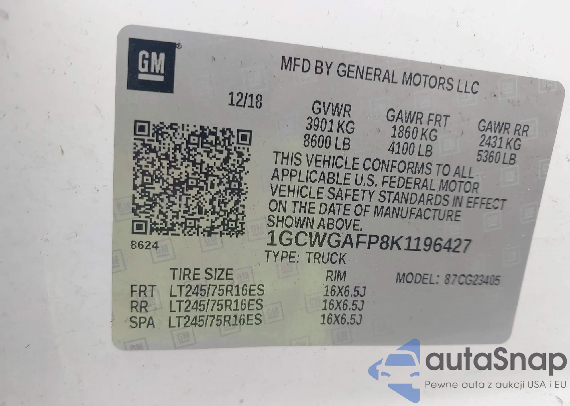 • VIN: 1GCWGAFP8K1196427