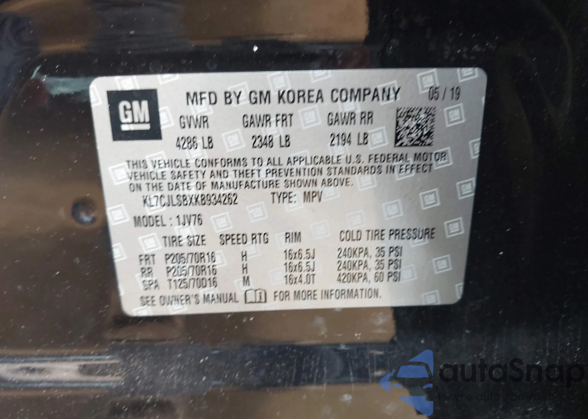VIN: KL7CJLSBXKB934262