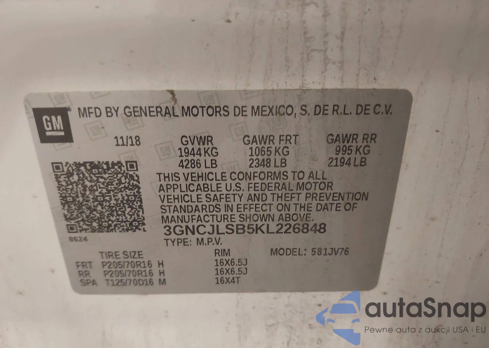 VIN: 3GNCJLSB5KL226848
