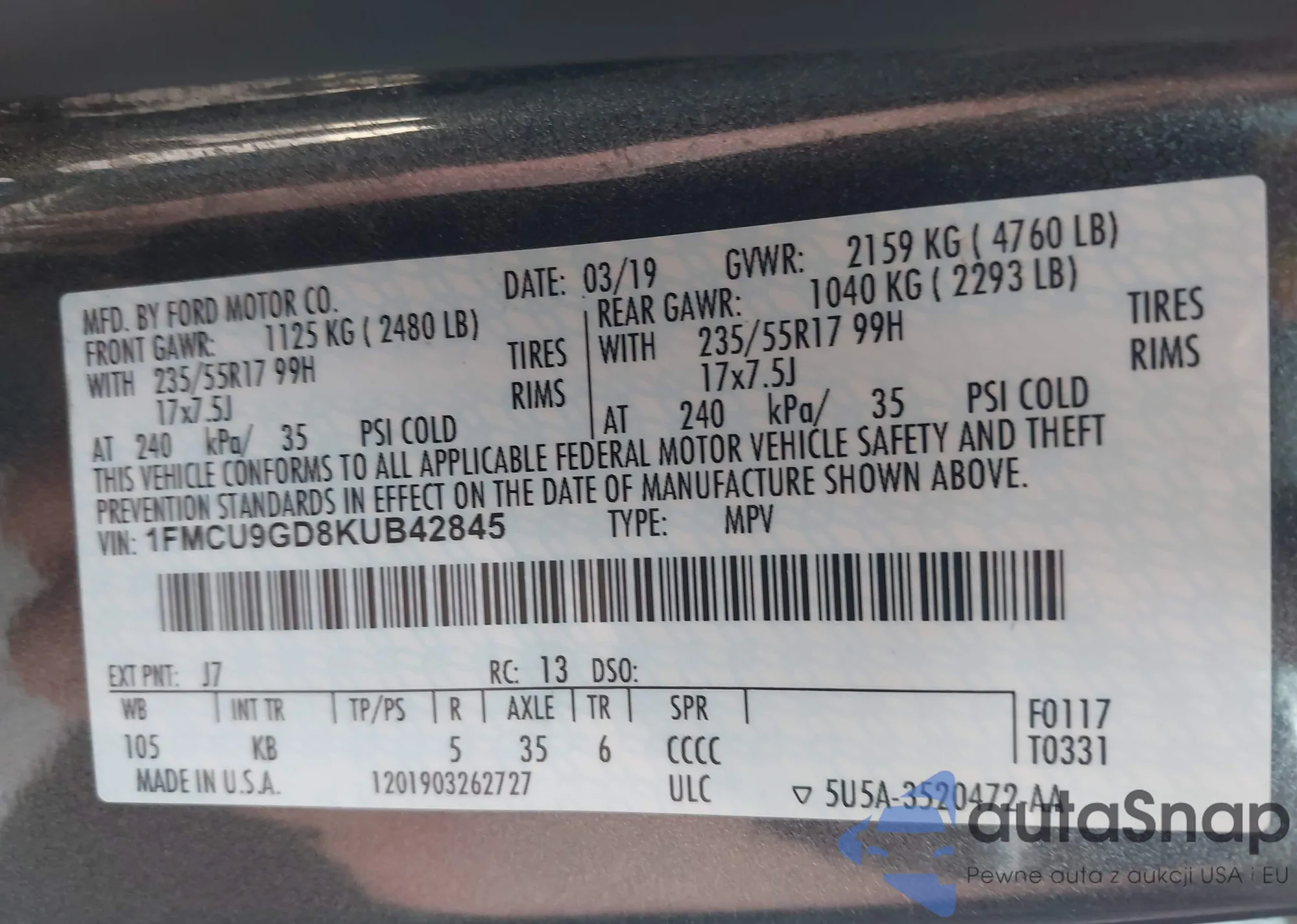 VIN: 1FMCU9GD8KUB42845