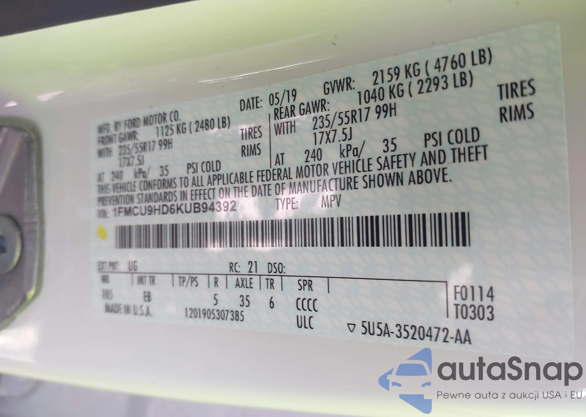 VIN: 1FMCU9HD6KUB94392