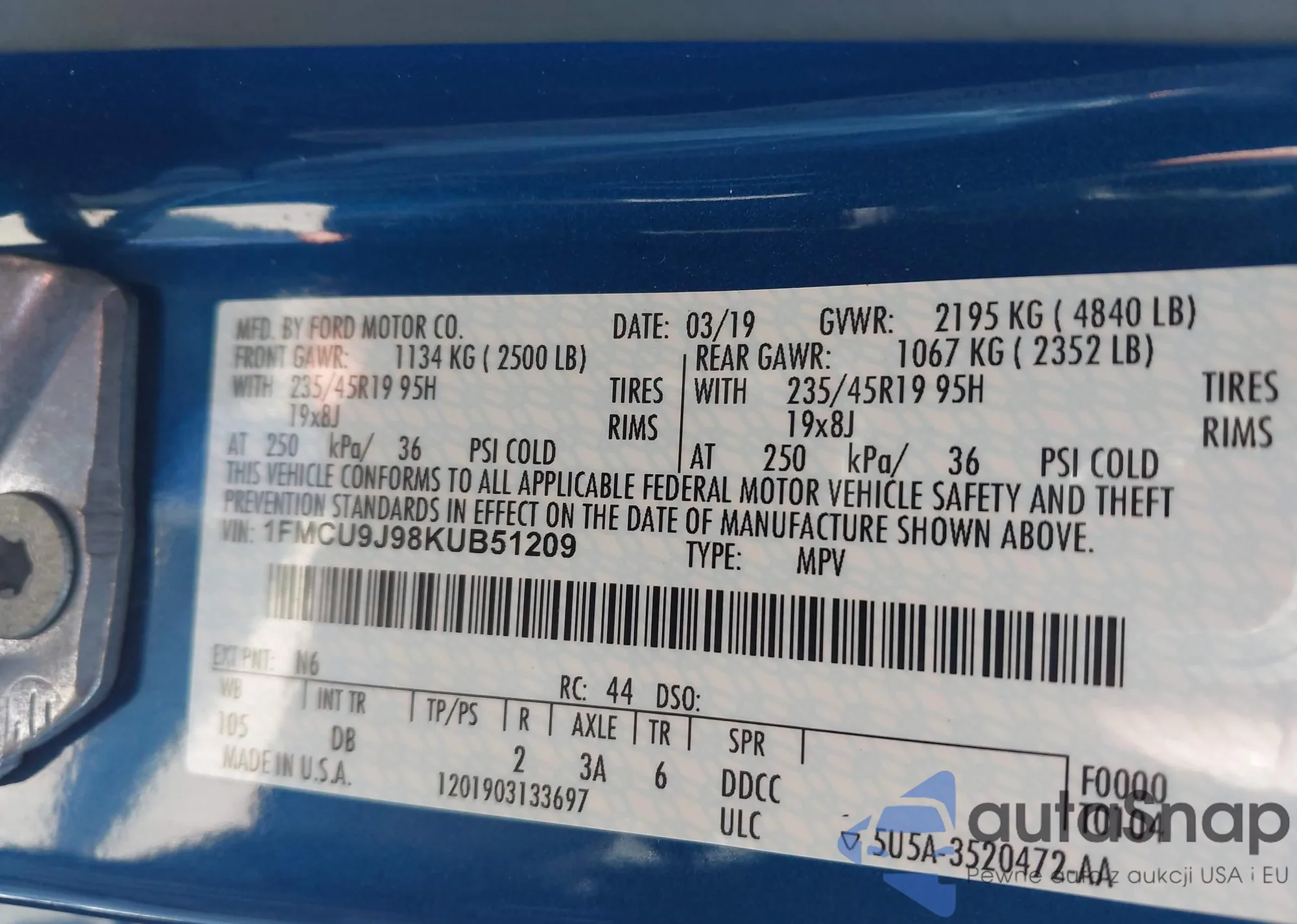 VIN: 1FMCU9J98KUB51209