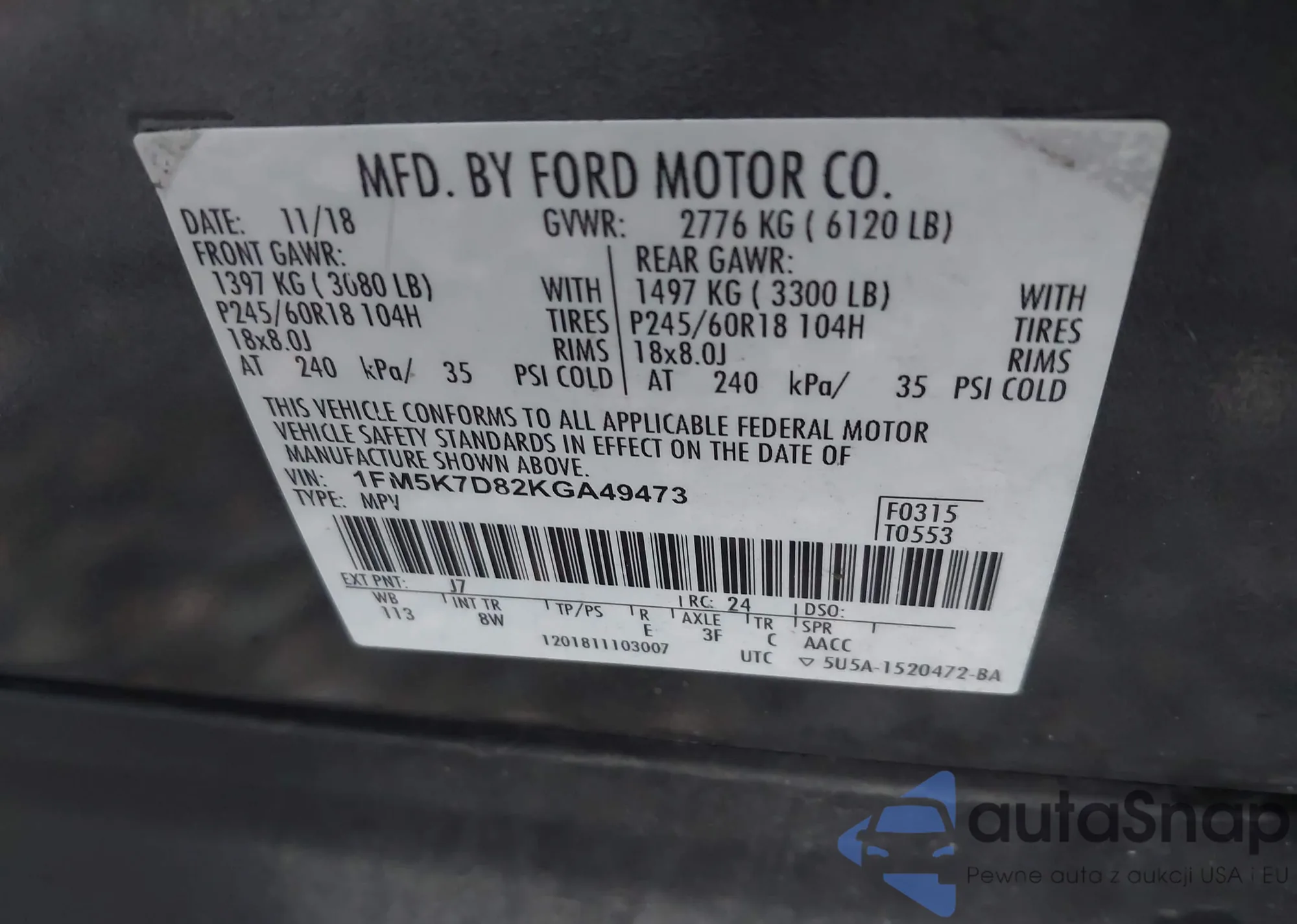 VIN: 1FM5K7D82KGA49473