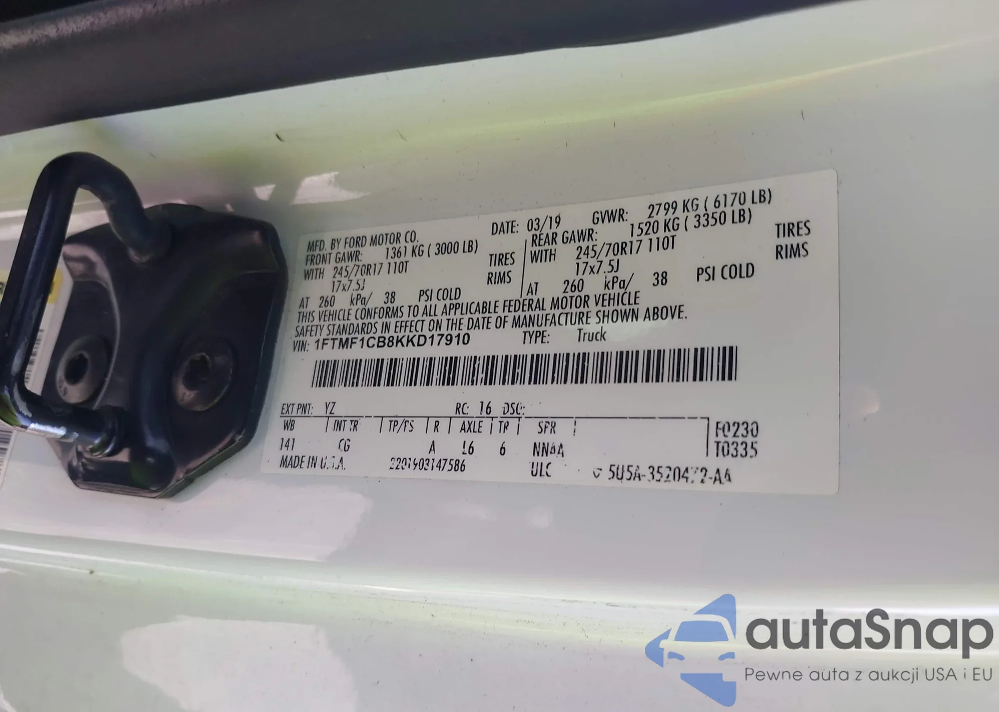 Автомобиль Ford F-150 2019 (VIN 1FTMF1CB8KKD17910) ранее не участвовал в торгах. Документы чистые, пробег соответствует или ниже среднего по рынку. Продаётся страховой компанией — рекомендуем покупку. Доставка в порт займет около 6–8 недель.