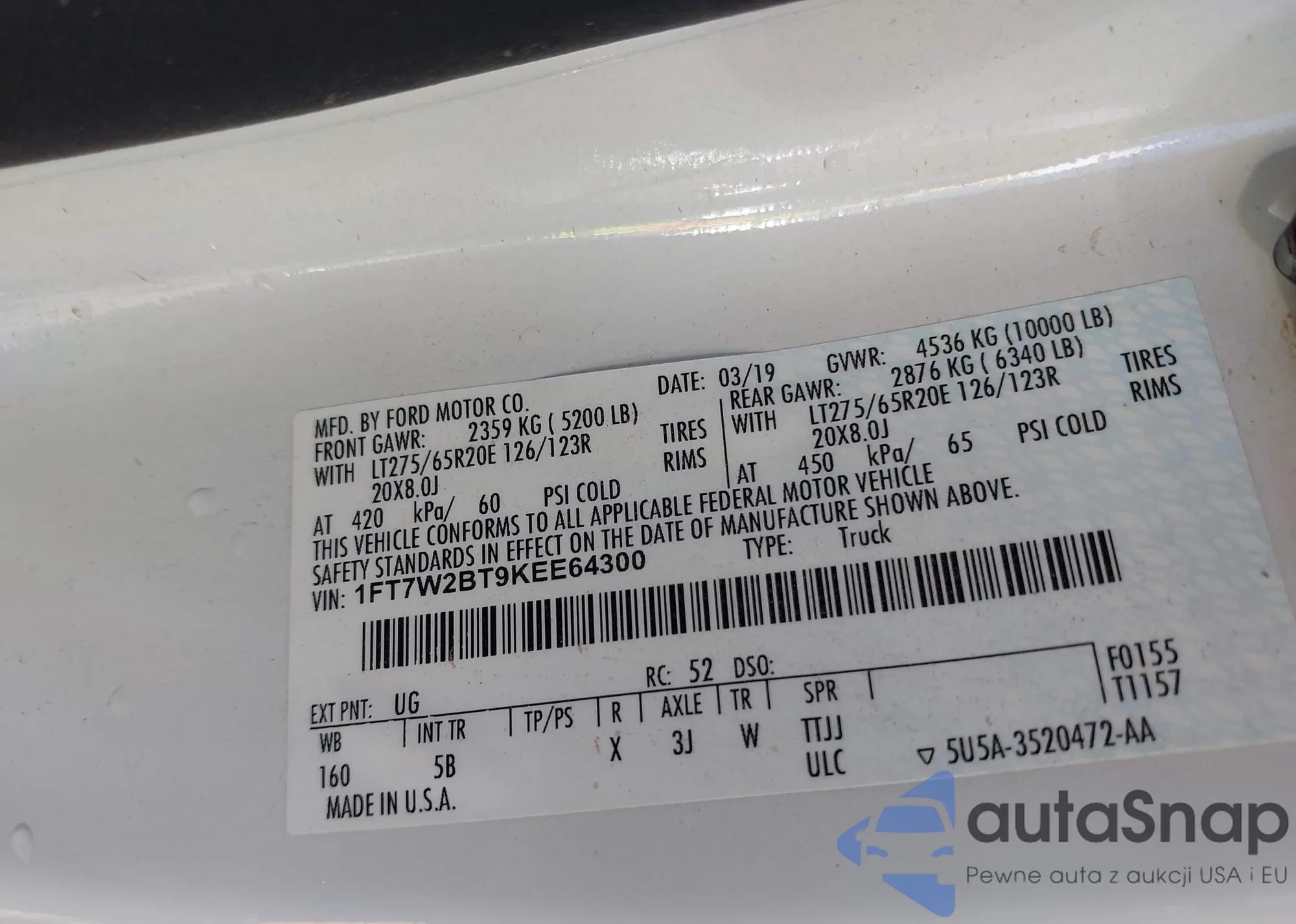 Автомобиль Ford F250 2019 (VIN 1FT7W2BT9KEE64300) ранее не участвовал в торгах. Документы чистые, пробег соответствует или ниже среднего по рынку. Продаётся страховой компанией — рекомендуем покупку. Доставка в порт займет около 6–8 недель.