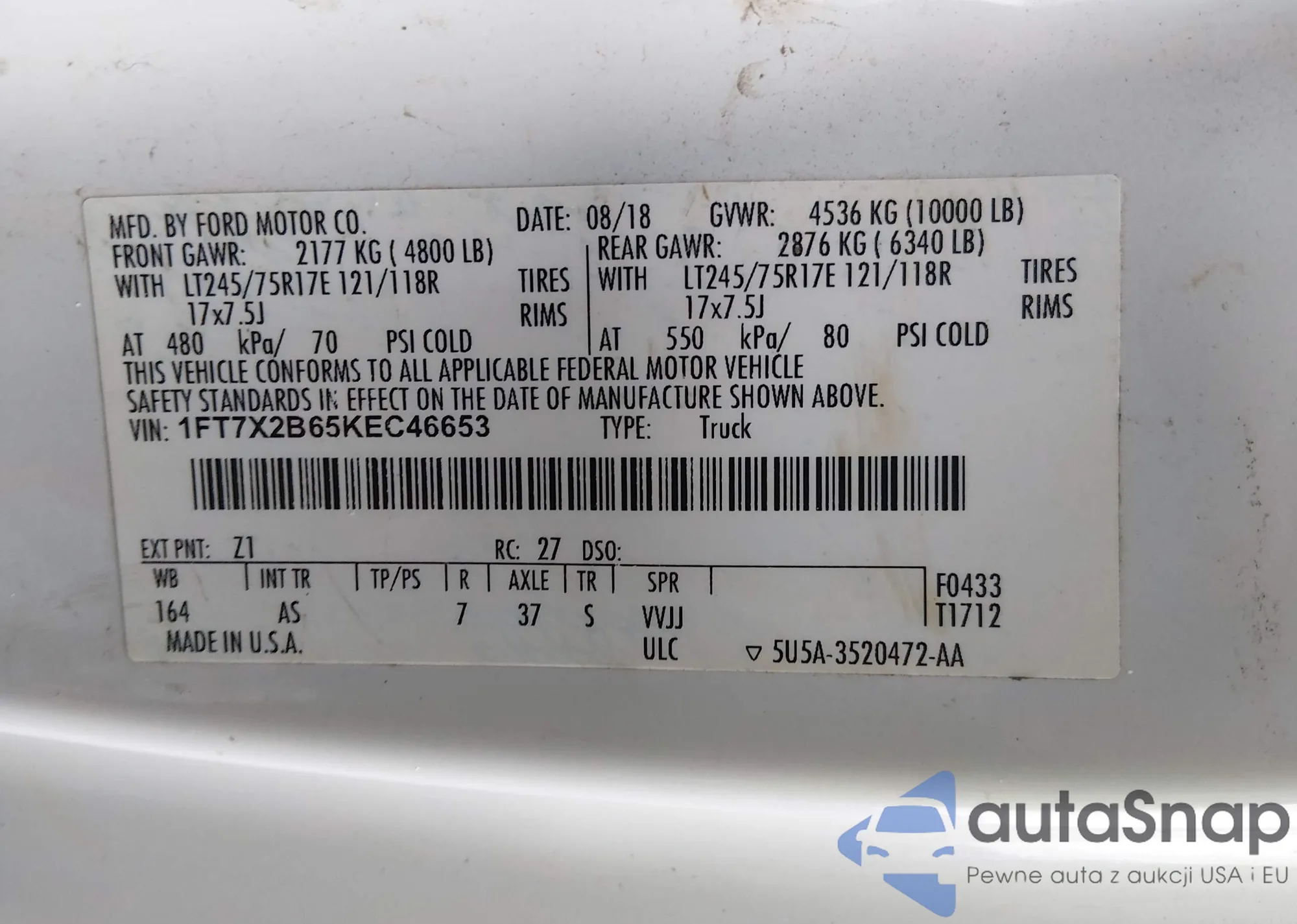 VIN: 1FT7X2B65KEC46653