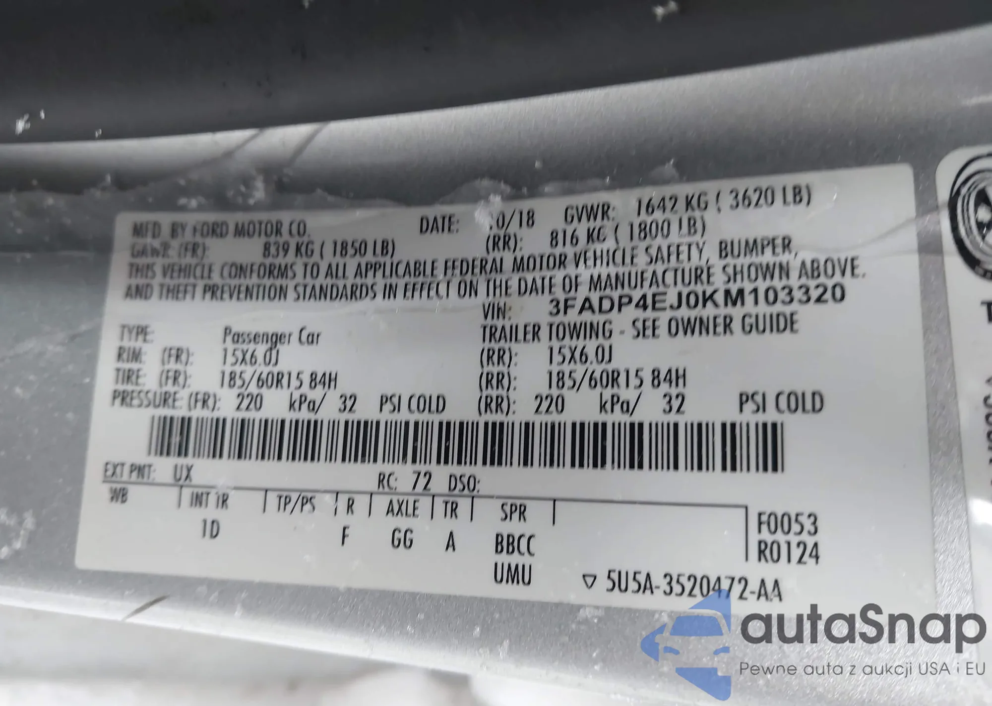 VIN: 3FADP4EJ0KM103320
