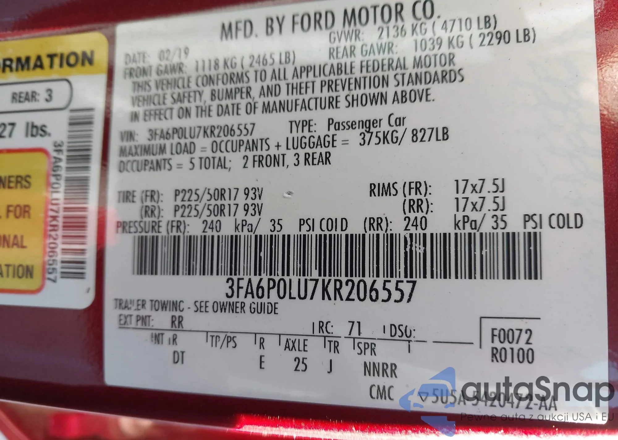 Автомобиль Ford Fusion 2019 (VIN 3FA6P0LU7KR206557) ранее не участвовал в торгах. Документы чистые, пробег соответствует или ниже среднего по рынку. Продаётся страховой компанией — рекомендуем покупку. Доставка в порт займет около 6–8 недель.
