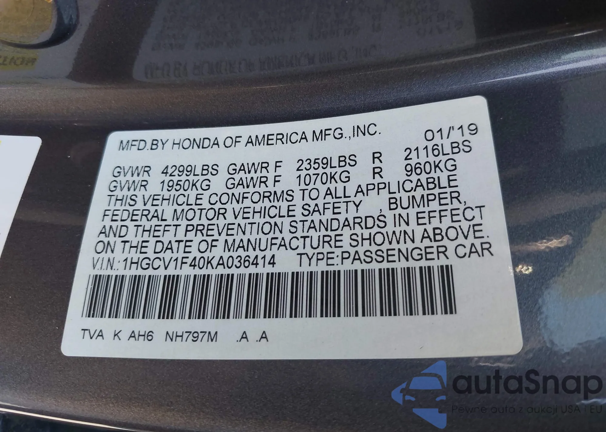 VIN: 1HGCV1F40KA036414