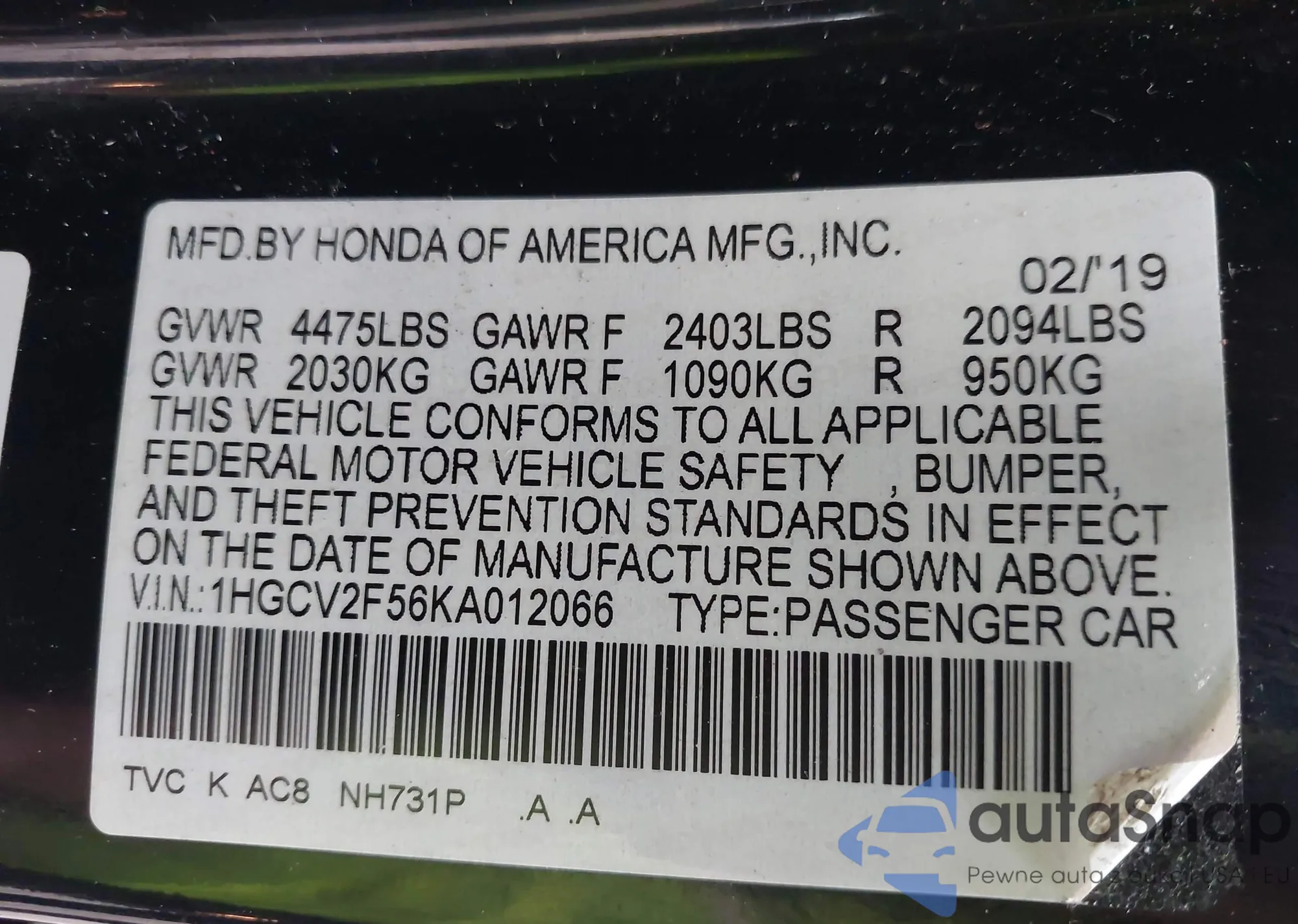 VIN: 1HGCV2F56KA012066