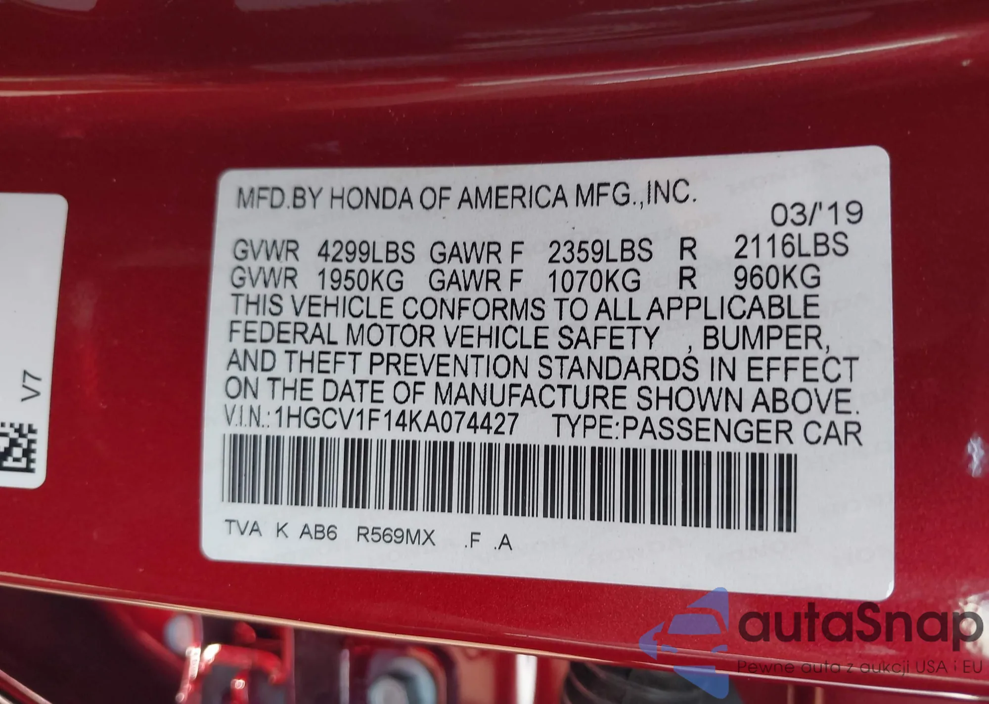 VIN: 1HGCV1F14KA074427