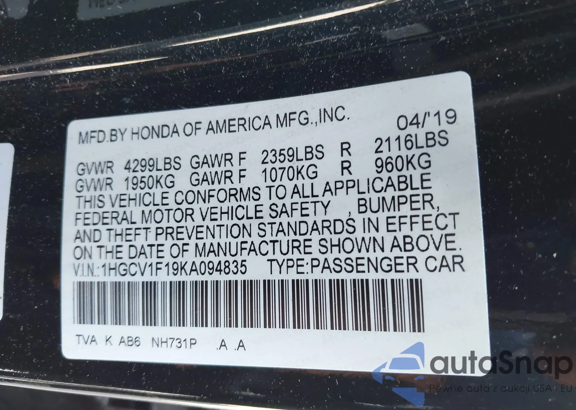 VIN: 1HGCV1F19KA094835
