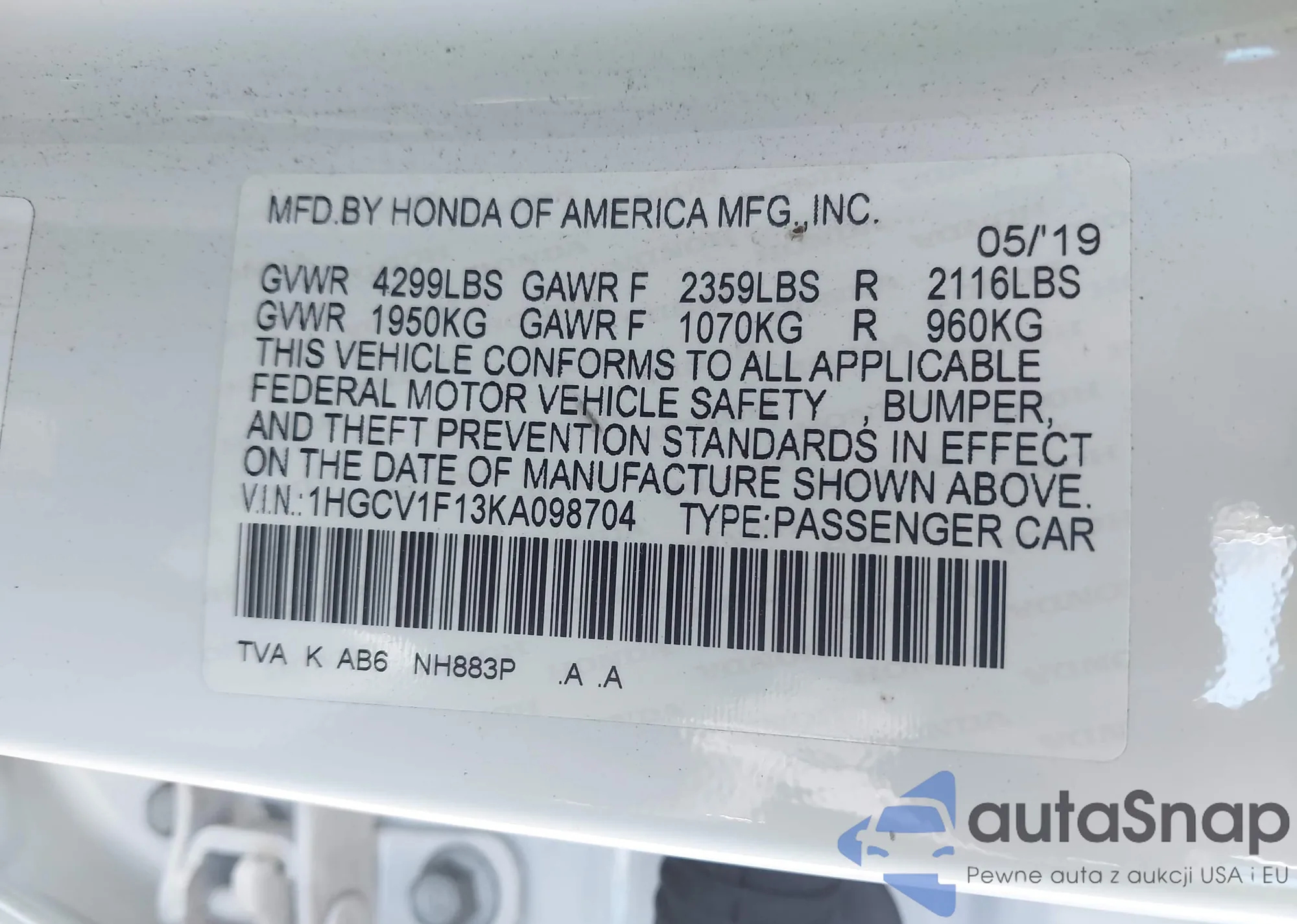 VIN: 1HGCV1F13KA098704