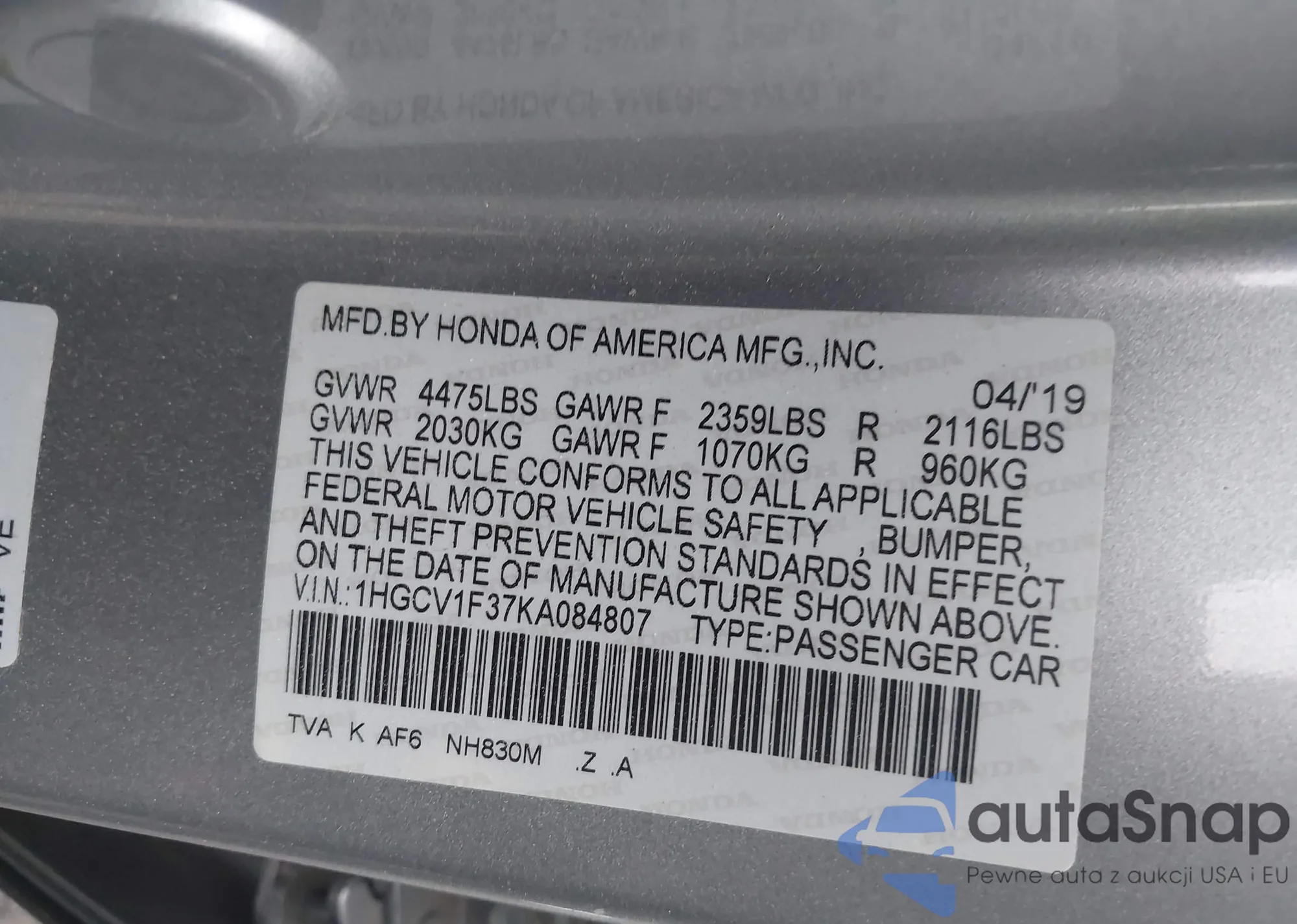 • VIN: 1HGCV1F37KA084807