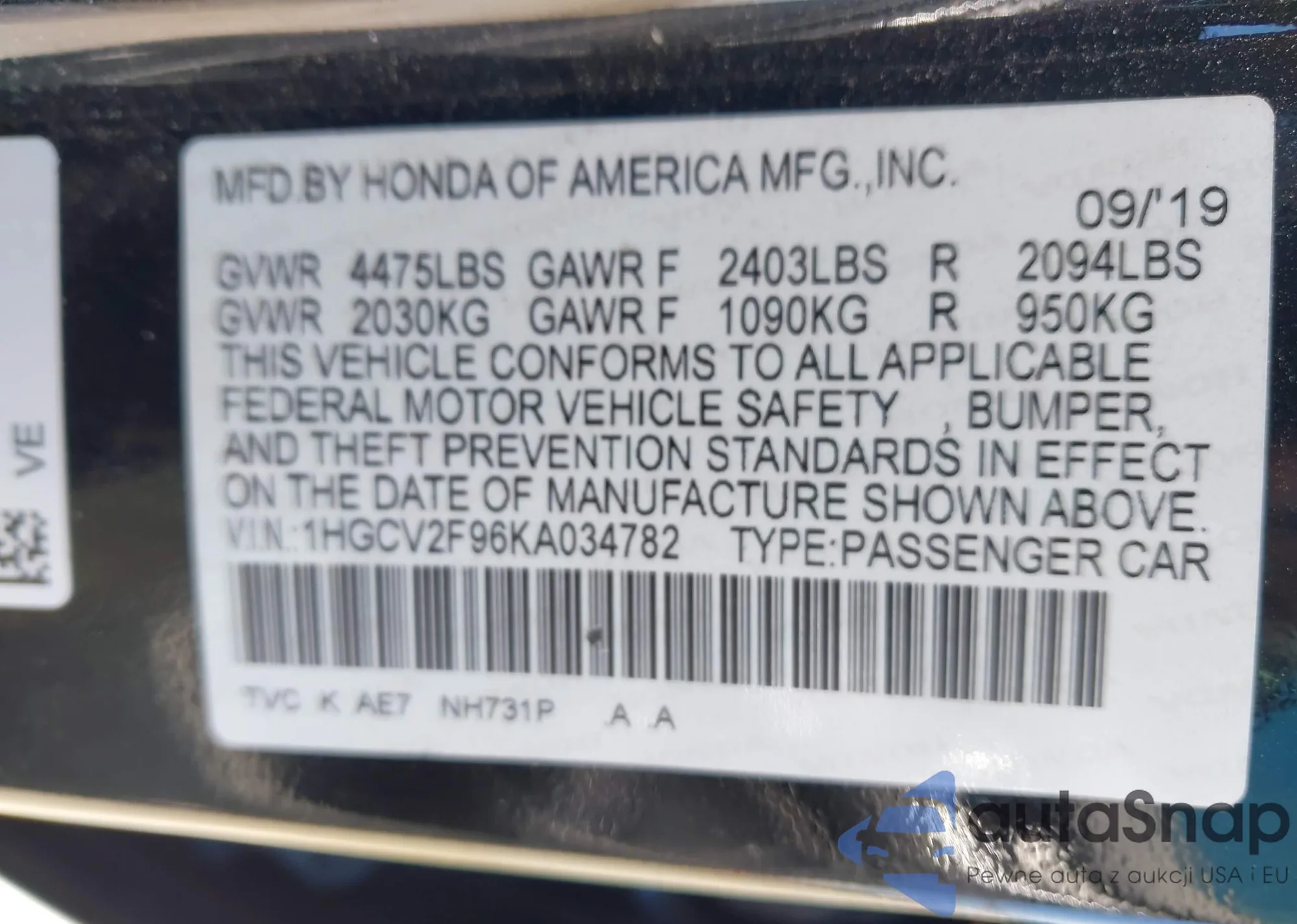VIN: 1HGCV2F96KA034782