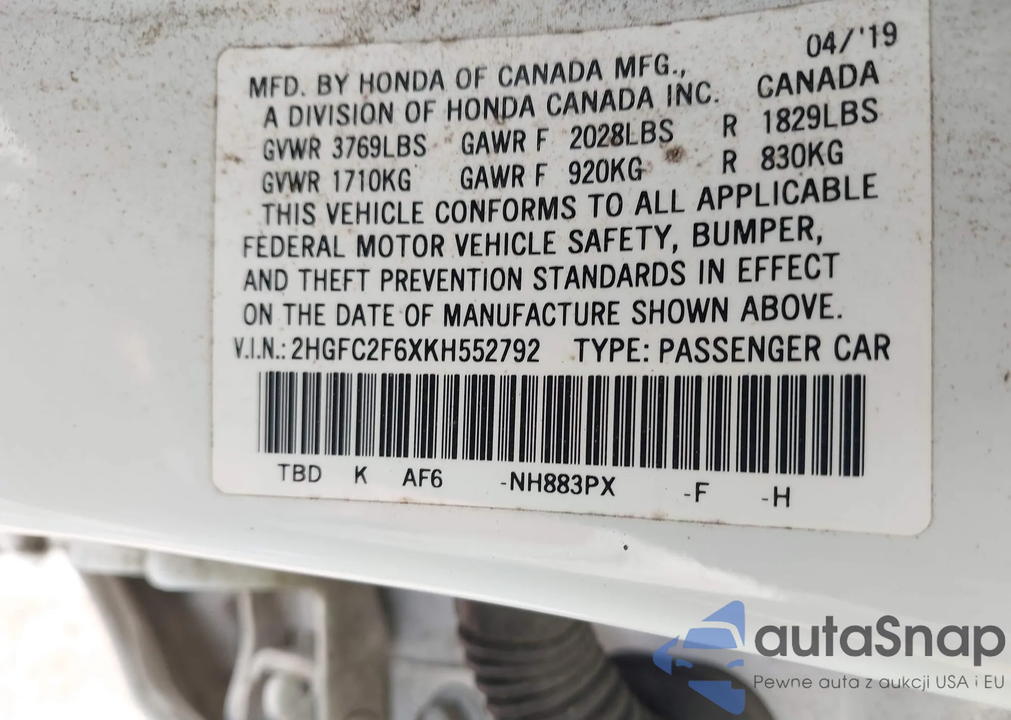 VIN: 2HGFC2F6XKH552792