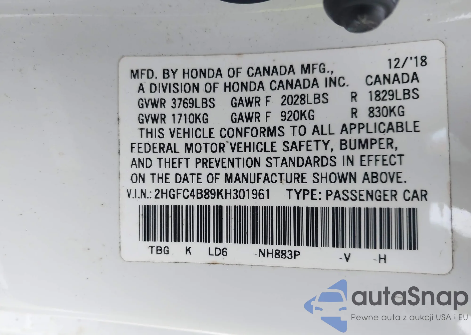 VIN: 2HGFC4B89KH301961