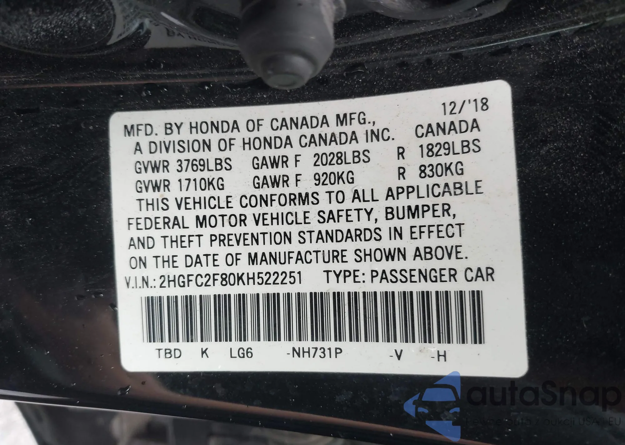 VIN: 2HGFC2F80KH522251