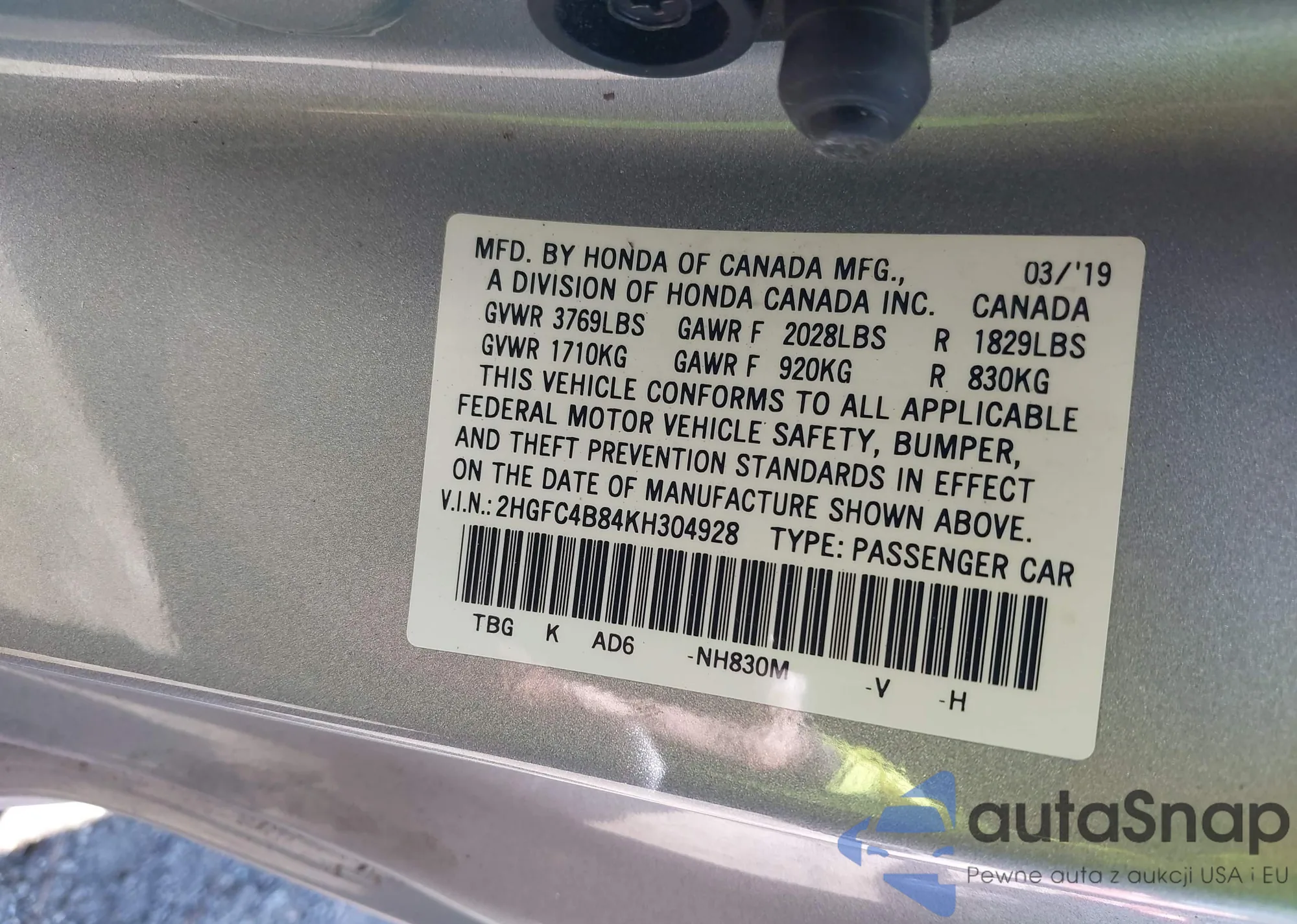 VIN: 2HGFC4B84KH304928