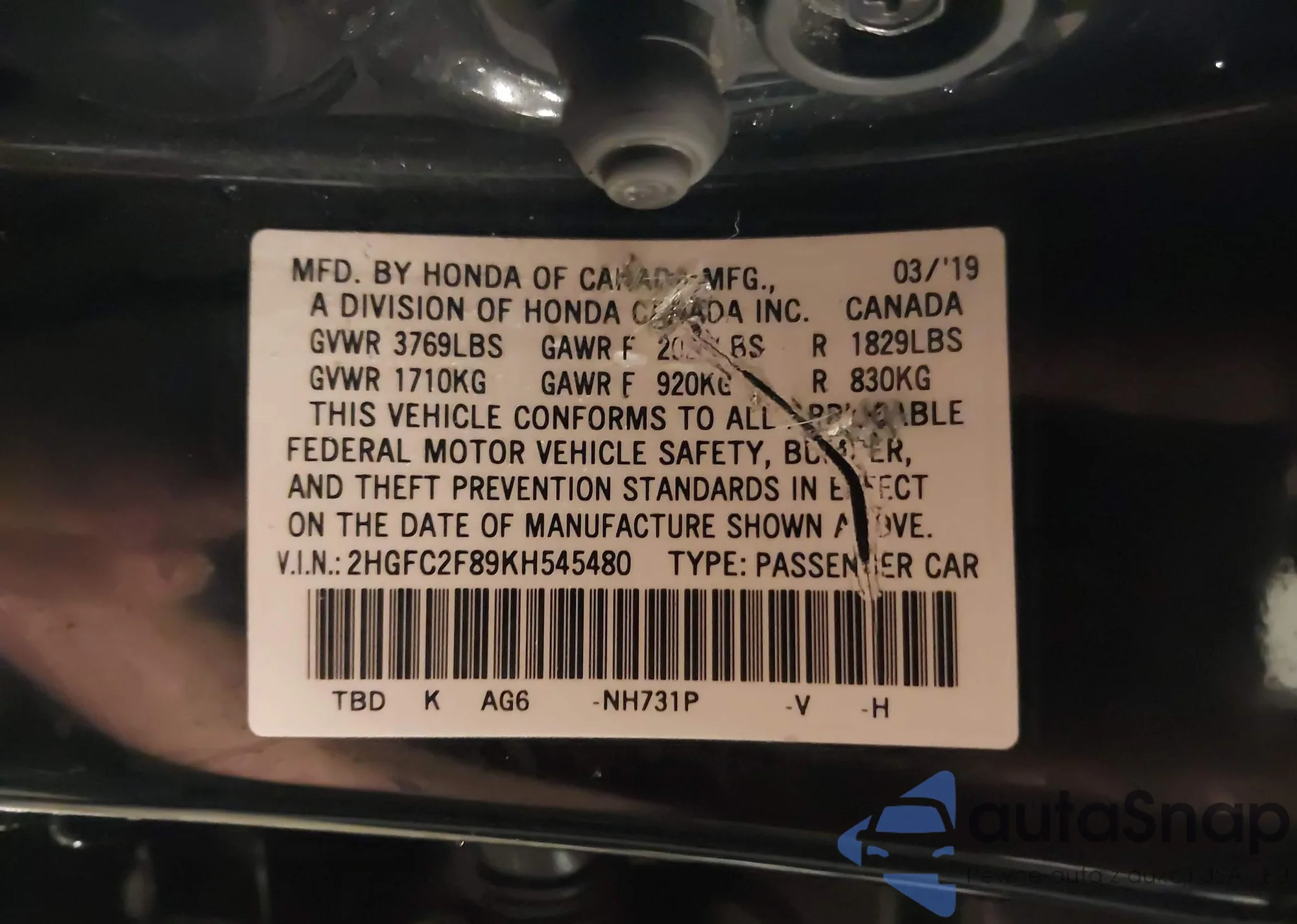 VIN: 2HGFC2F89KH545480