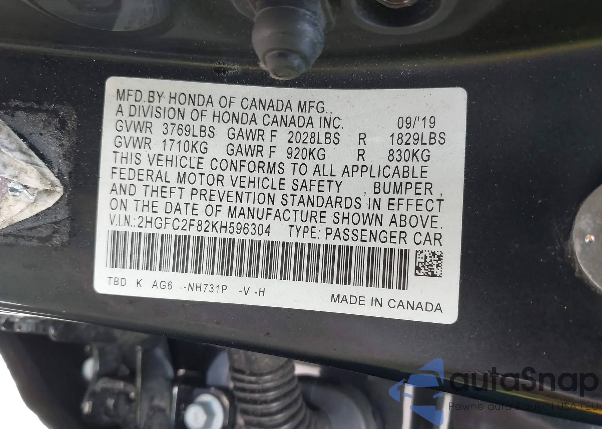 VIN: 2HGFC2F82KH596304