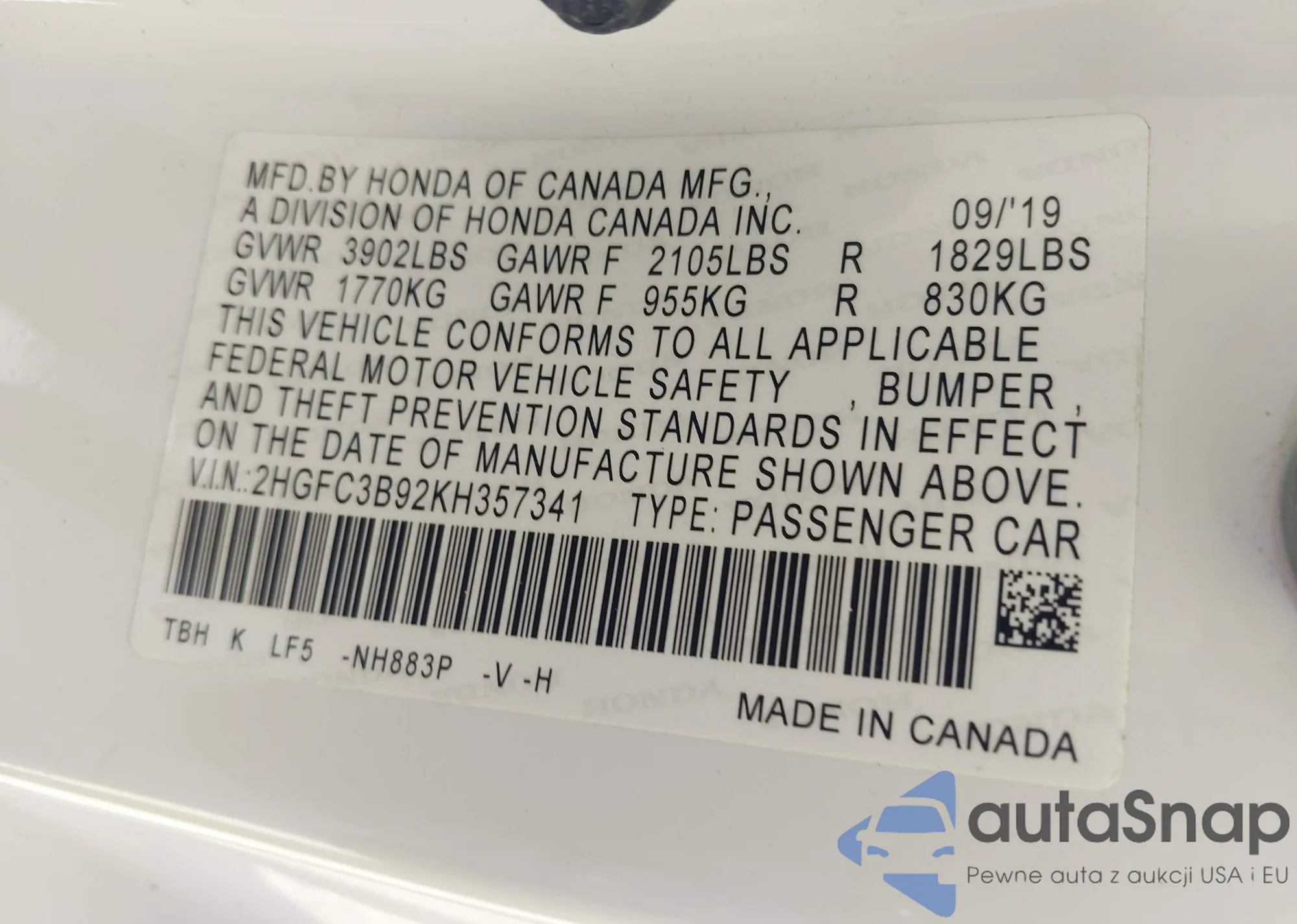 Автомобиль Honda Civic 2019 (VIN 2HGFC3B92KH357341) ранее не участвовал в торгах. Документы чистые, пробег соответствует или ниже среднего по рынку. Продаётся страховой компанией — рекомендуем покупку. Доставка в порт займет около 6–8 недель.