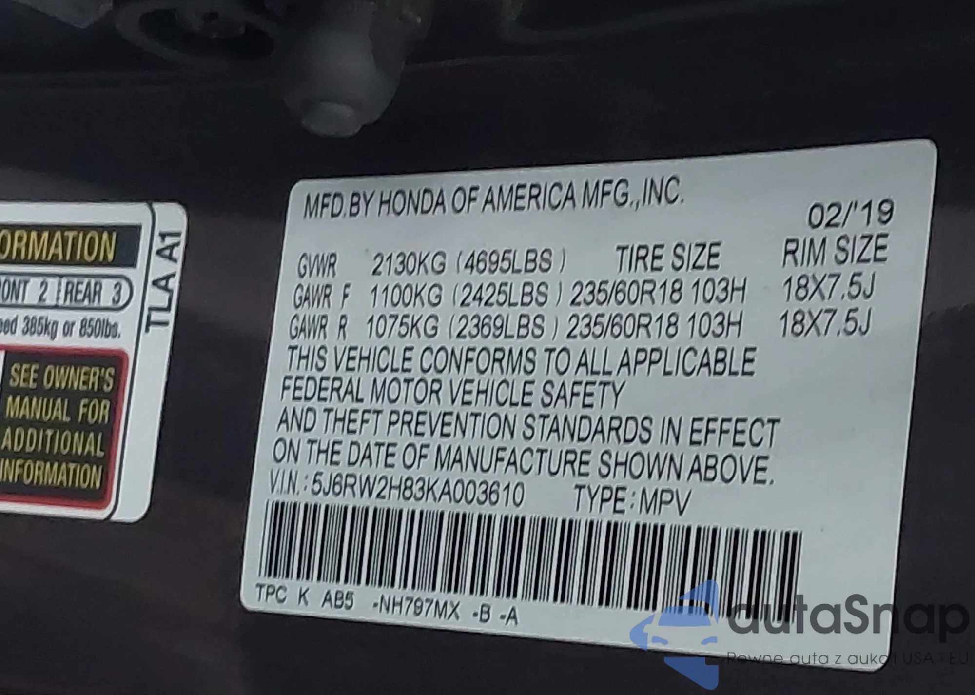 Автомобиль Honda CR-V 2019 (VIN 5J6RW2H83KA003610) ранее не участвовал в торгах. Документы чистые, пробег соответствует или ниже среднего по рынку. Продаётся страховой компанией — рекомендуем покупку. Доставка в порт займет около 6–8 недель.