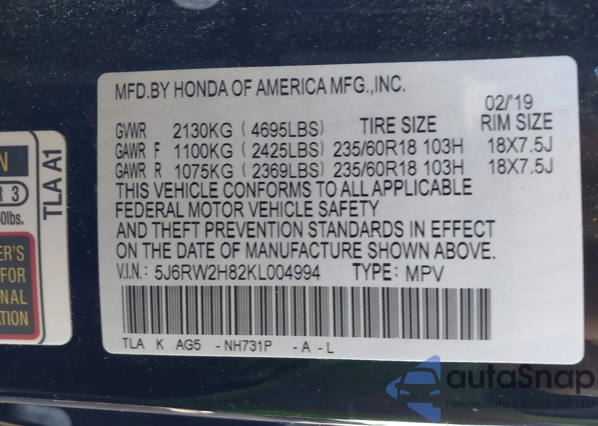 VIN: 5J6RW2H82KL004994